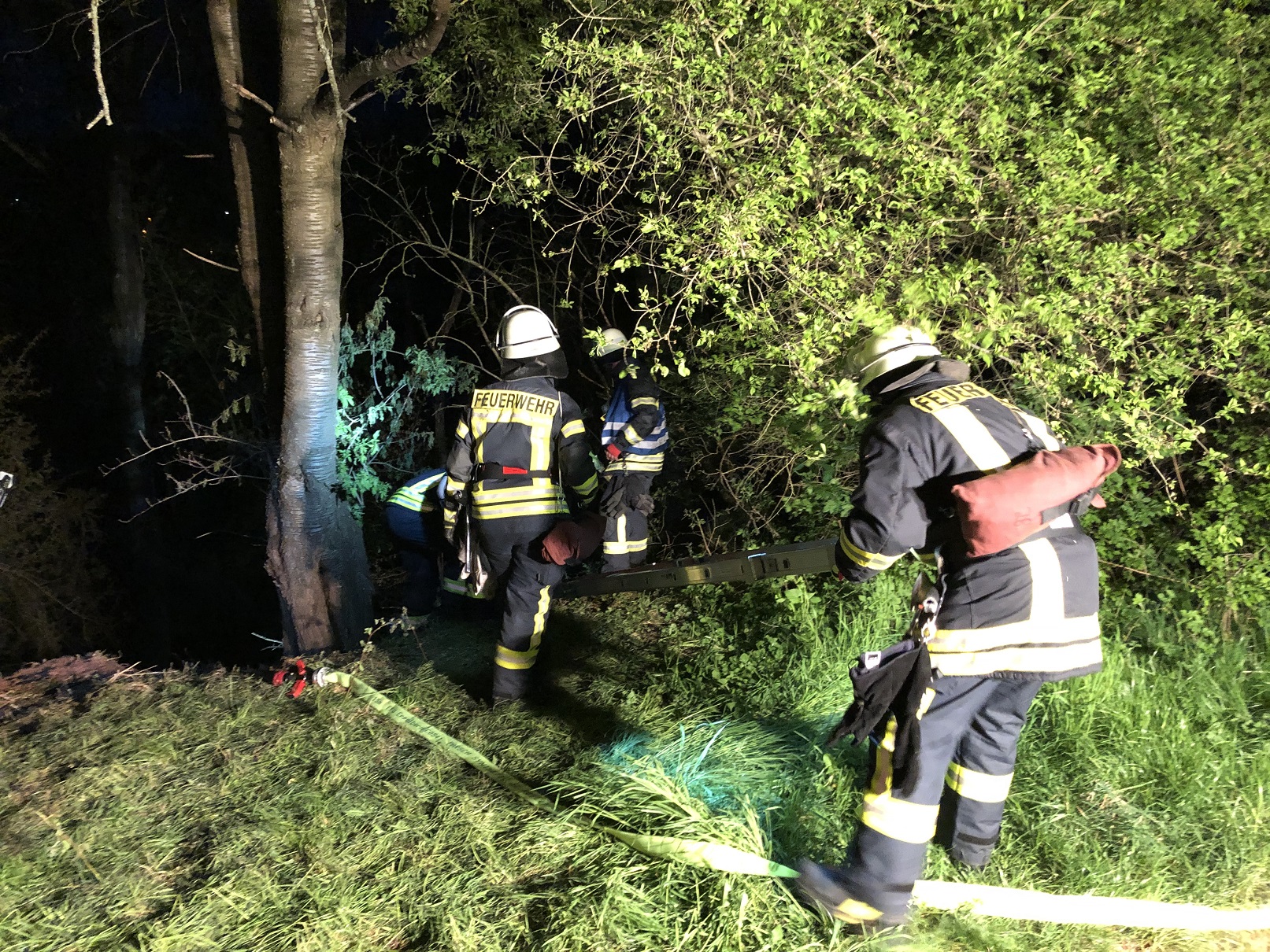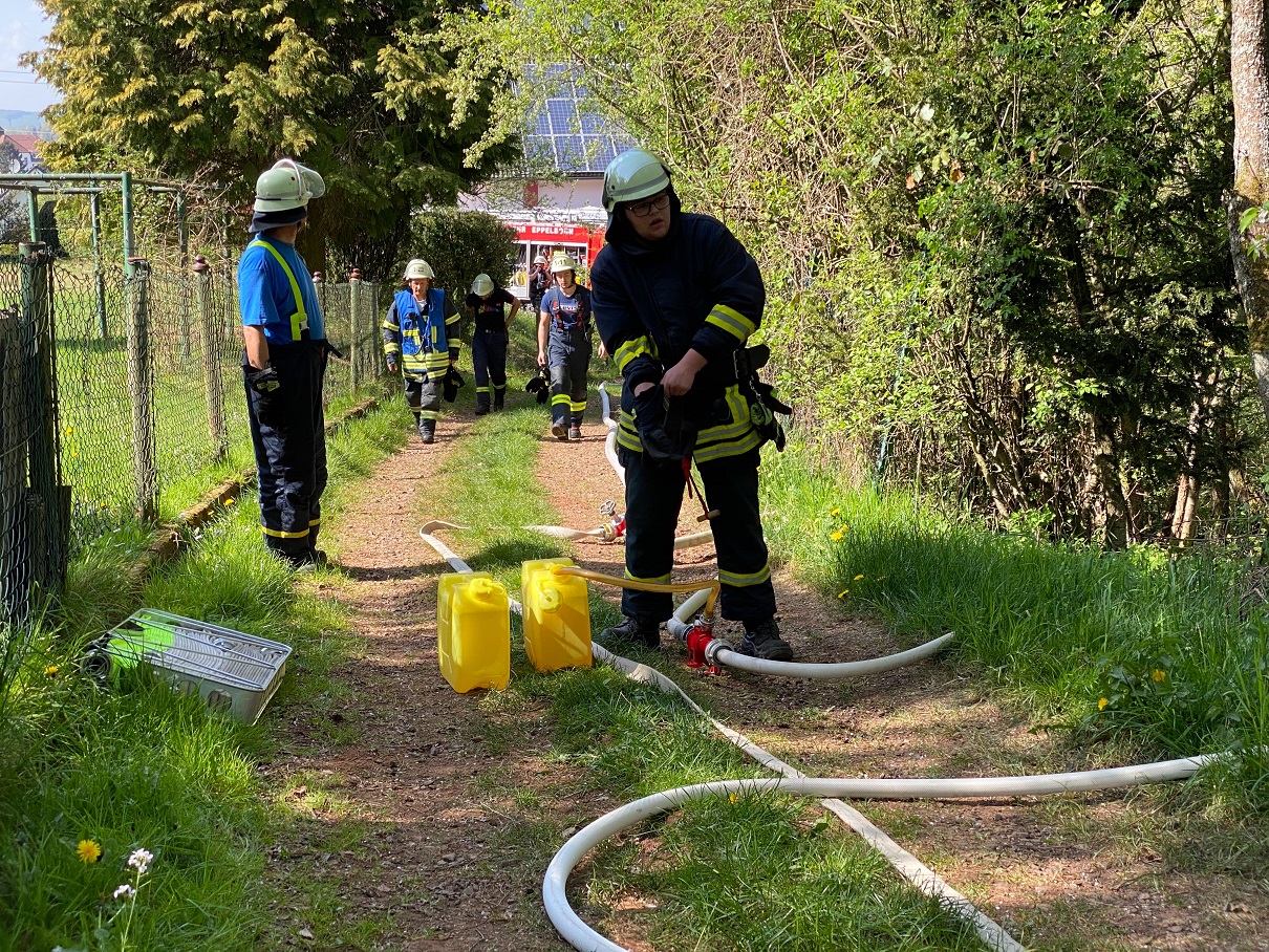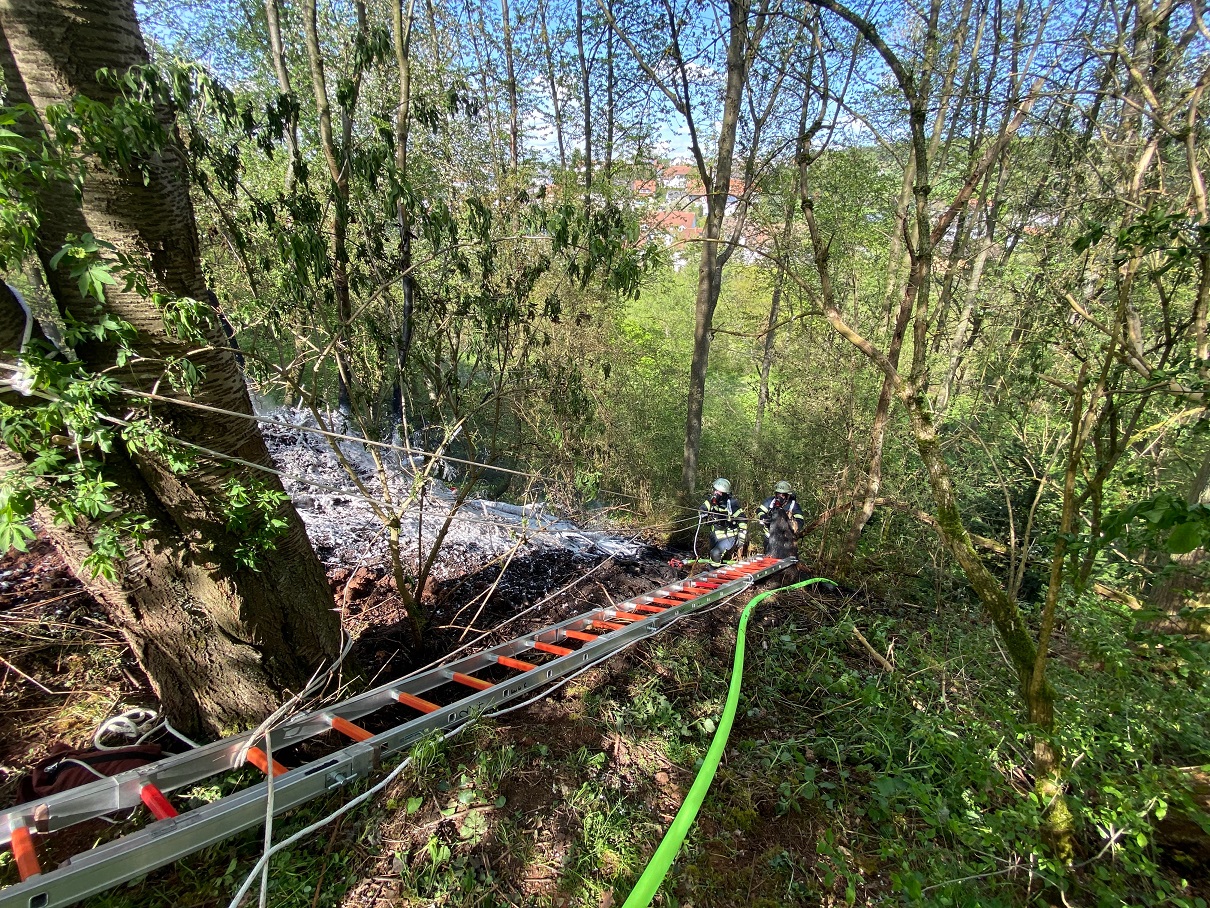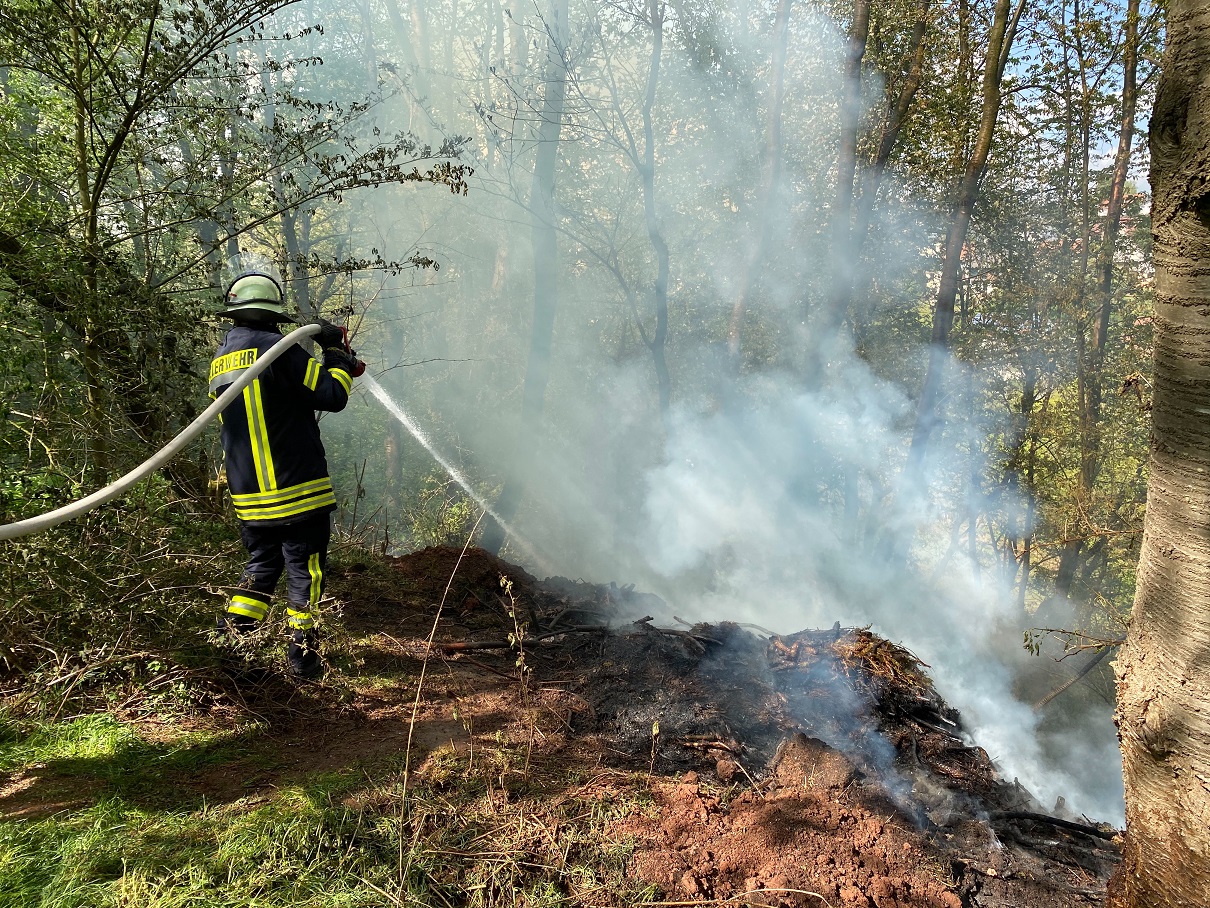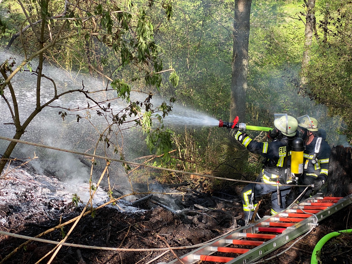 Sofort wurde der Brand unter Vornahme einer Löschangriffsleitung eingedämmt und die offenen Flammen abgelöscht, sodass sich das Feuer nicht weiter in das Waldstück ausbreiten konnte.
