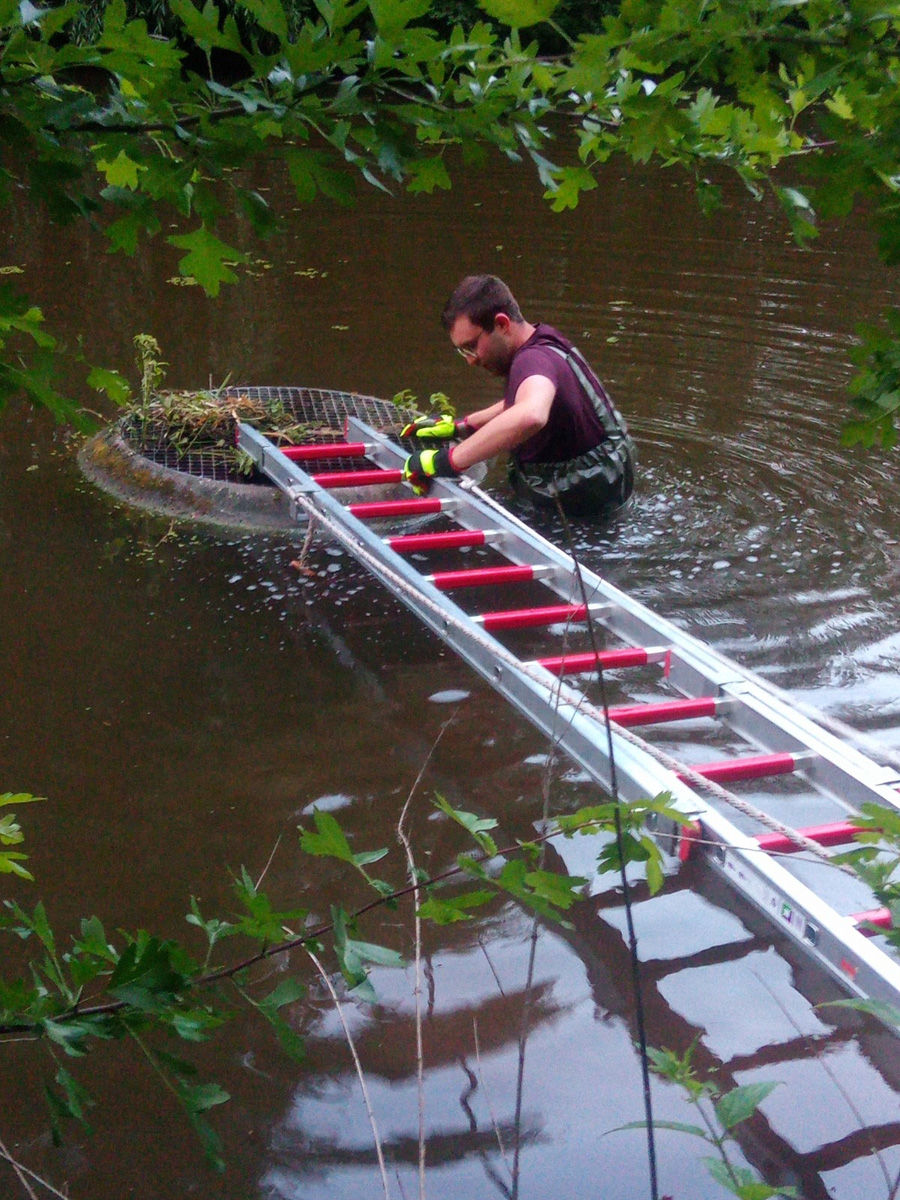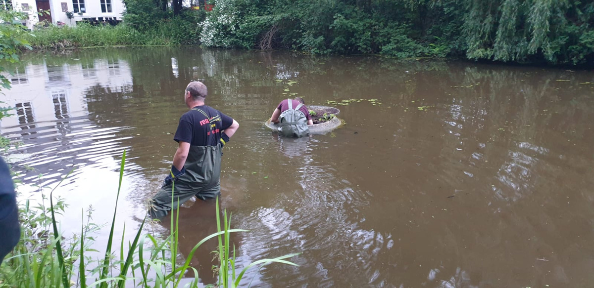 Tierischer Einsatz am Schlossweiher von Schloss Buseck in Bubach-Calmesweiler: Spaziergänger hatten am 04. Juni 2020 bemerkt, dass eines von ungefähr acht Entenküken in den Ablaufschacht des Schlossweihers gefallen war. Die Entenmutter hatte auf dem daraufliegenden Gitter ihr Nest gebaut, doch war eines der Kleinen durch eine beschädigte Stelle gefallen.