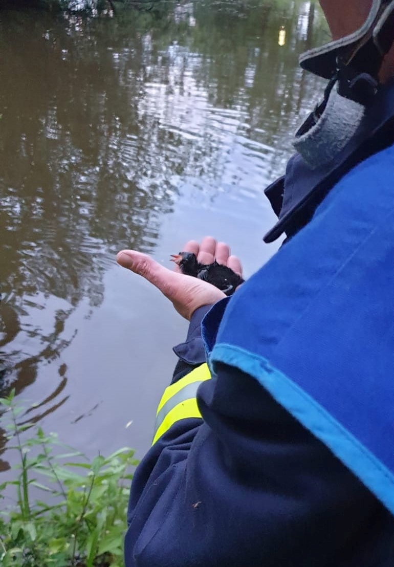 Die alarmierte Feuerwehr konnte das kleine Küken in einer Tiefe von etwas über einem Meter entdecken. Ausgerüstet mit Wathosen entfernten daraufhin zwei Kameraden das Schutzgitter und konnten das Küken mit einer Schaufel aus dem Schacht retten. Es wurde zurück in das Nest gelegt.
