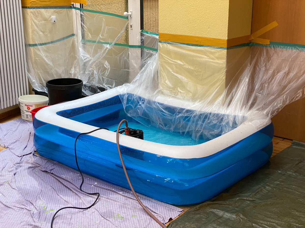 Da die Pumpe der Feuerwehr aber viel zu stark für einen Dauerbetrieb gewesen wäre, wurde eine kleinere Pumpe organisiert, die über einen Niveauschalter das Becken bei überschreiten eines bestimmten Pegels leer pumpte.