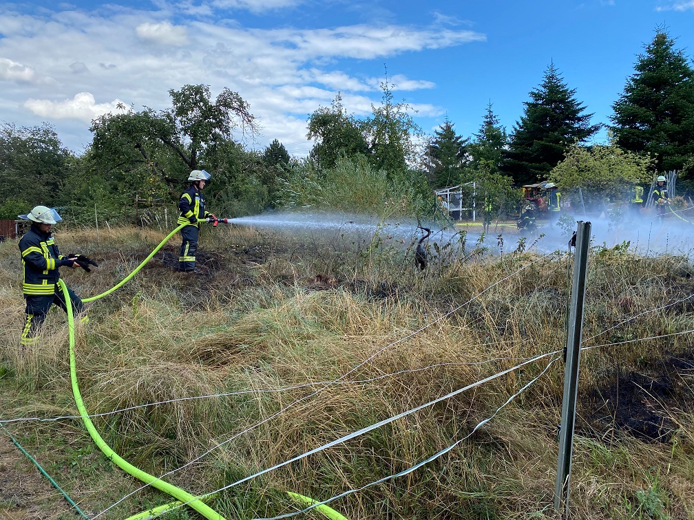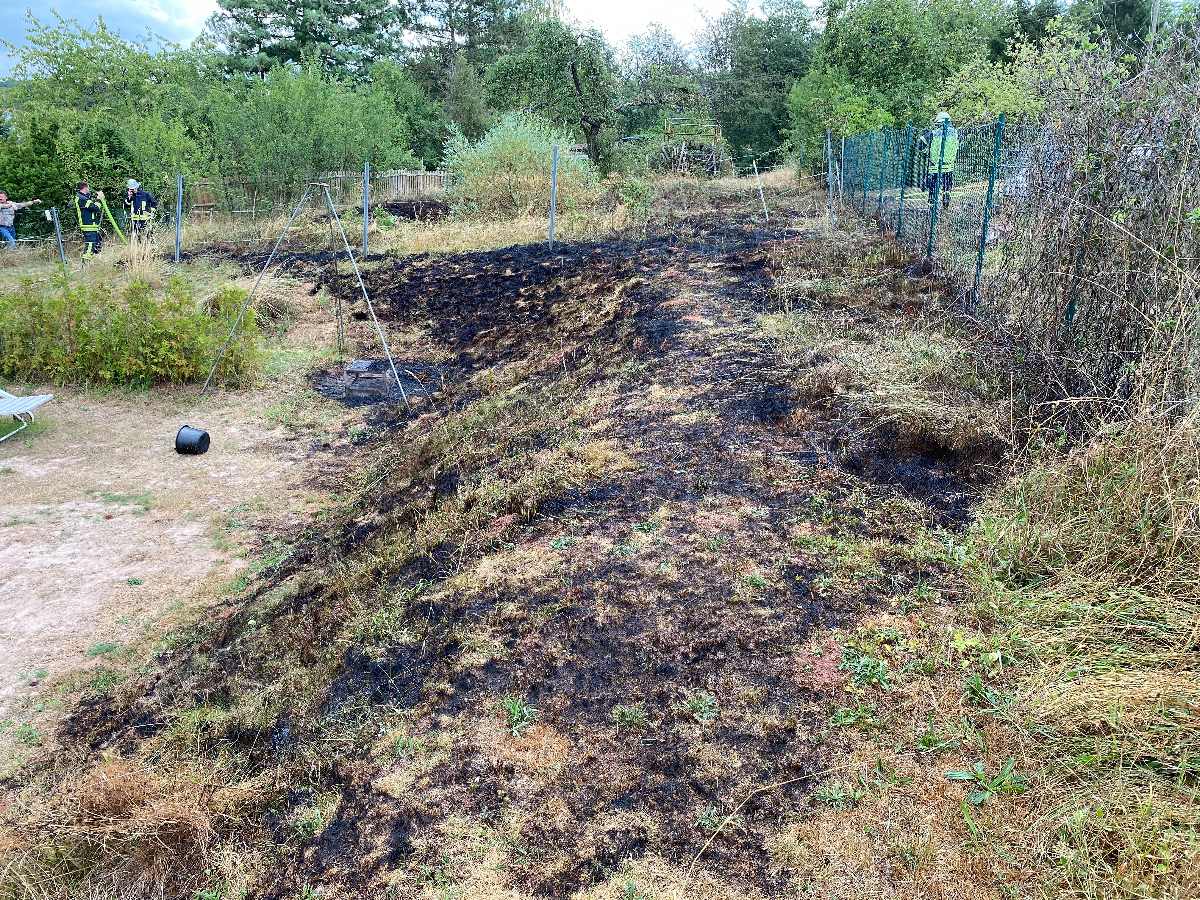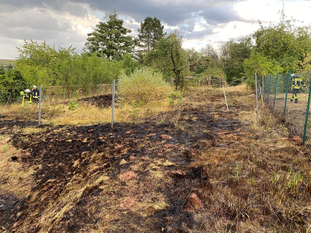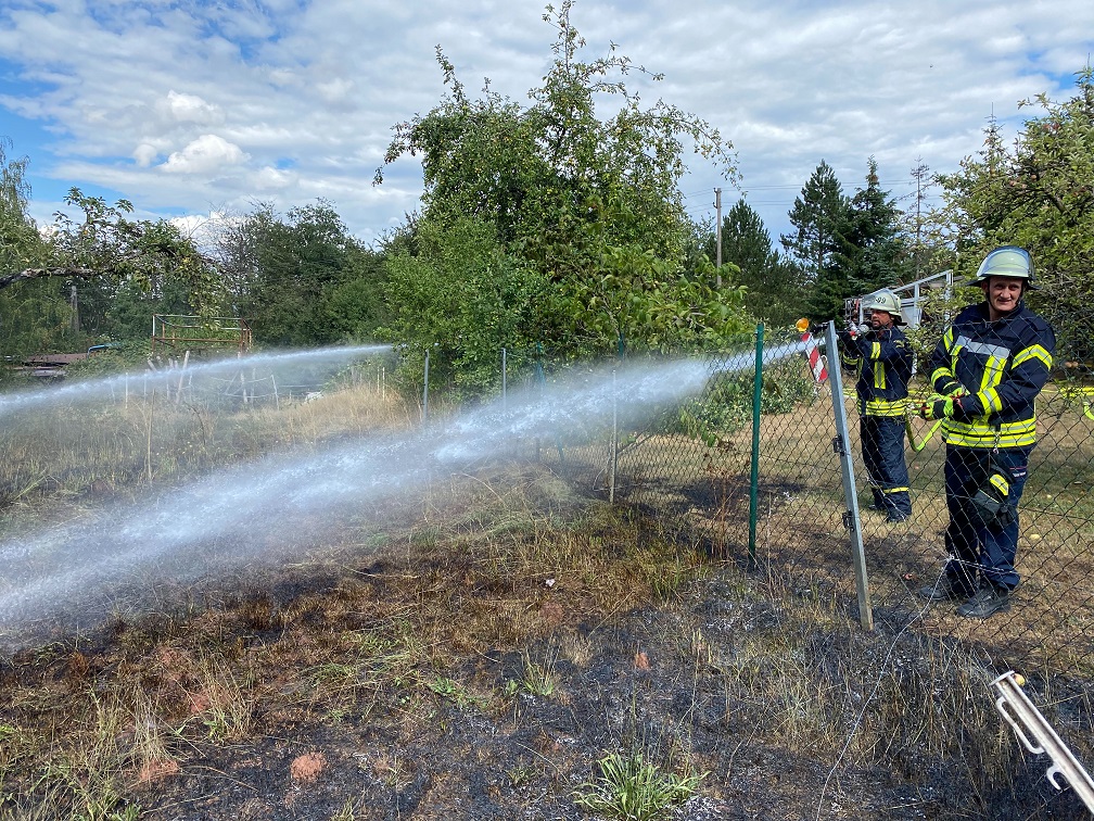 Auch der lang ersehnte Regen der Nacht vom 16. auf den 17.08.2020 war nur ein Tropfen auf den heißen Stein sodass am Nachmittag des 17. August eine Wiesenfläche hinter einem Wohnhaus in der Straße "Im halben Mond" Feuer fing.