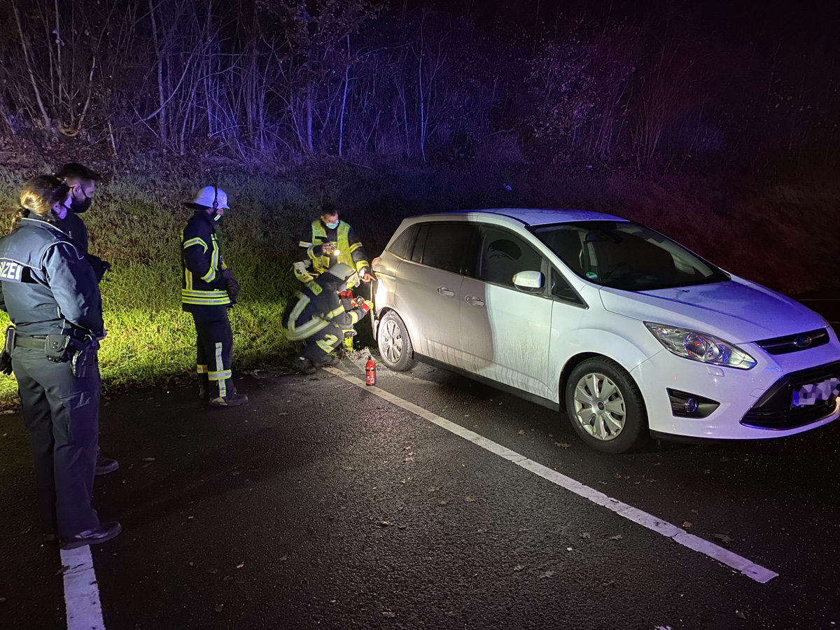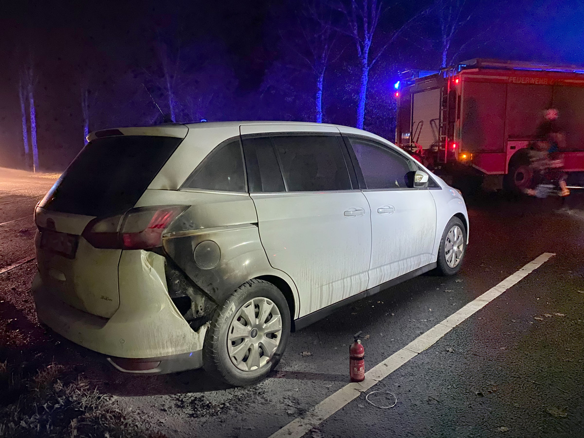 Gegen 5:00 Uhr bemerkte ein aufmerksamer Autofahrer Flammen an einem auf dem Mitfahrerparkplatz an der L112 abgestellten Pkw. Es gelang ihm, den noch recht kleinen Brand mit einem Feuerlöscher zu bekämpfen. Im Anschluss alarmierte er Polizei und Feuerwehr.
