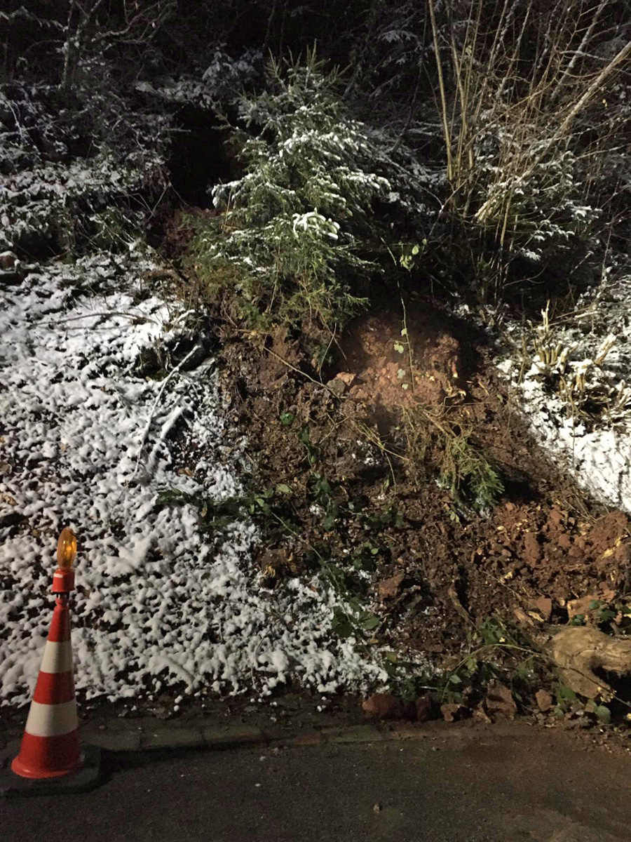 Die starken und anhaltenden Regenfälle der vergangenen Tage hatten am Morgen des 09. Februar 2021 einen alten Baumstumpf und Erdmassen von einem Hang auf die Humeser Straße gespült. Ein Autofahrer hatte dies bemerkt und die Feuerwehr alarmiert.