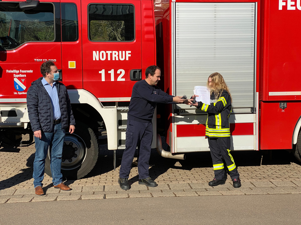 Löschbezirksführer Eric Holzer überreichte ihr den ersehnten Funkmeldeempfänger, mit dem sie künftig zu ihren Einsätzen gerufen werden wird. Und von dem Vorsitzenden des Fördervereins des Löschbezirks Eppelborn, Peter Hammerschmitt, erhielt sie als Willkommensgeschenk Jacke und Mütze des Löschbezirks.