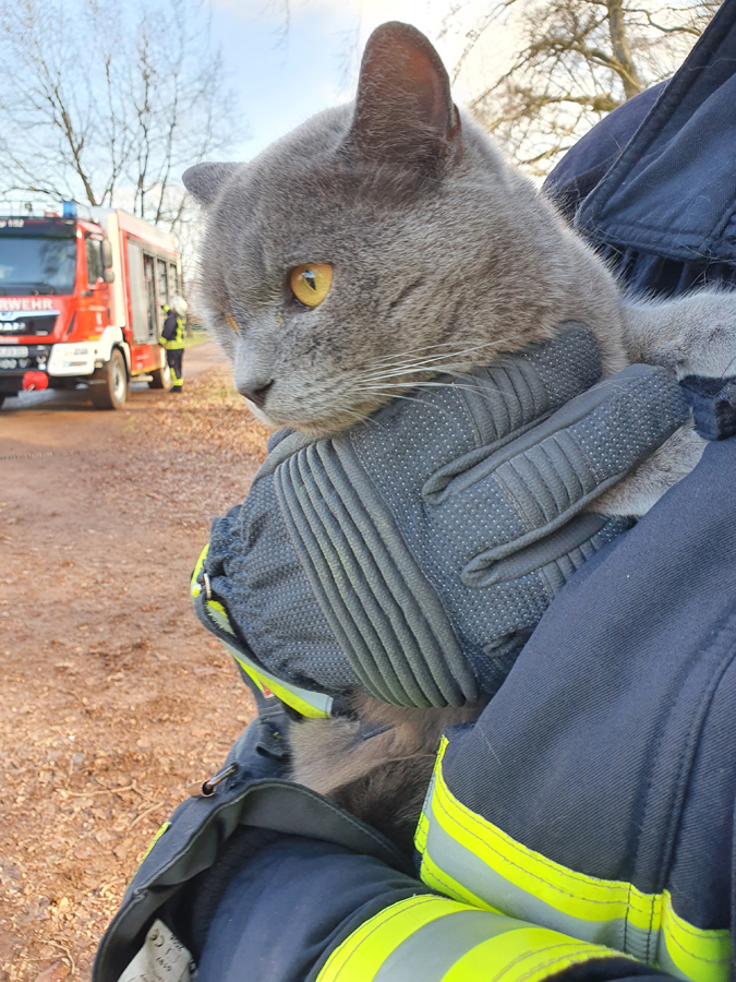 Am Samstag den 27.02. musste die Feuerwehr der Gemeinde Eppelborn, kurz nach dem Kellerbrand in der Galgenbergstraße erneut zu einer Katzenrettung ausrücken. Diesmal hatte sich eine Katze am Waldrand des Hellwaldes im Ortsteil Eppelborn bei ihrem Ausflug auf einen Baum verirrt und traute sich nicht mehr herunter. Nachdem das verängstigte Tier bereits seit einiger Zeit festsaß, alarmierten aufmerksame Spaziergänger am 27.02.2021 gegen 10:46 Uhr die Feuerwehr. Einsatzkräfte aus dem Löschbezirk Eppelborn trafen kurz darauf mit einem Tanköschfahrzeug und dem Rüstwagen an der Einsatzstelle ein. Eine Steckleiter wurde in Stellung gebracht, und ein Feuerwehrmann konnte die verängstige Katze sicher auf den Boden bringen. Das Tier wurde in, eine kurzfristig durch eine Feuerwehrangehörige organisierte Transportbox zum Gerätehaus Eppelborn gebracht. Die verstörte Katze konnte nach einigen Telefonaten an den Tierschutzbund übergeben werden. Der Tierschutzbund ist 24 Stunden erreichbar, die Helfer leisten "Erste-Hilfe" und verbringen die Tiere in geeignete Unterkünfte, oder führen sie ärztlicher Versorgung zu. Für Probleme sorgten bei der Anfahrt mehrere Fahrzeuge, die im Bereich des Friedhofs im Halteverbot geparkt waren. Durch die enge Zufahrtsstraße konnten die Großfahrzeuge erst nach erheblichen Diskussionen mit Zeitverzögerung die Einsatzstelle erreichen. Die Feuerwehr Eppelborn bittet alle Fahrzeugführer beim Parken des Fahrzeuges darauf zu achten, dass die Fahrspur auch für die Fahrzeuge der Feuerwehr passierbar bleiben. Bei einem kritischen Einsatz kann eine versperrte Durchfahrt zu einem verspäteten Einsatz führen, hierbei können Menschenleben auf dem Spiel stehen.