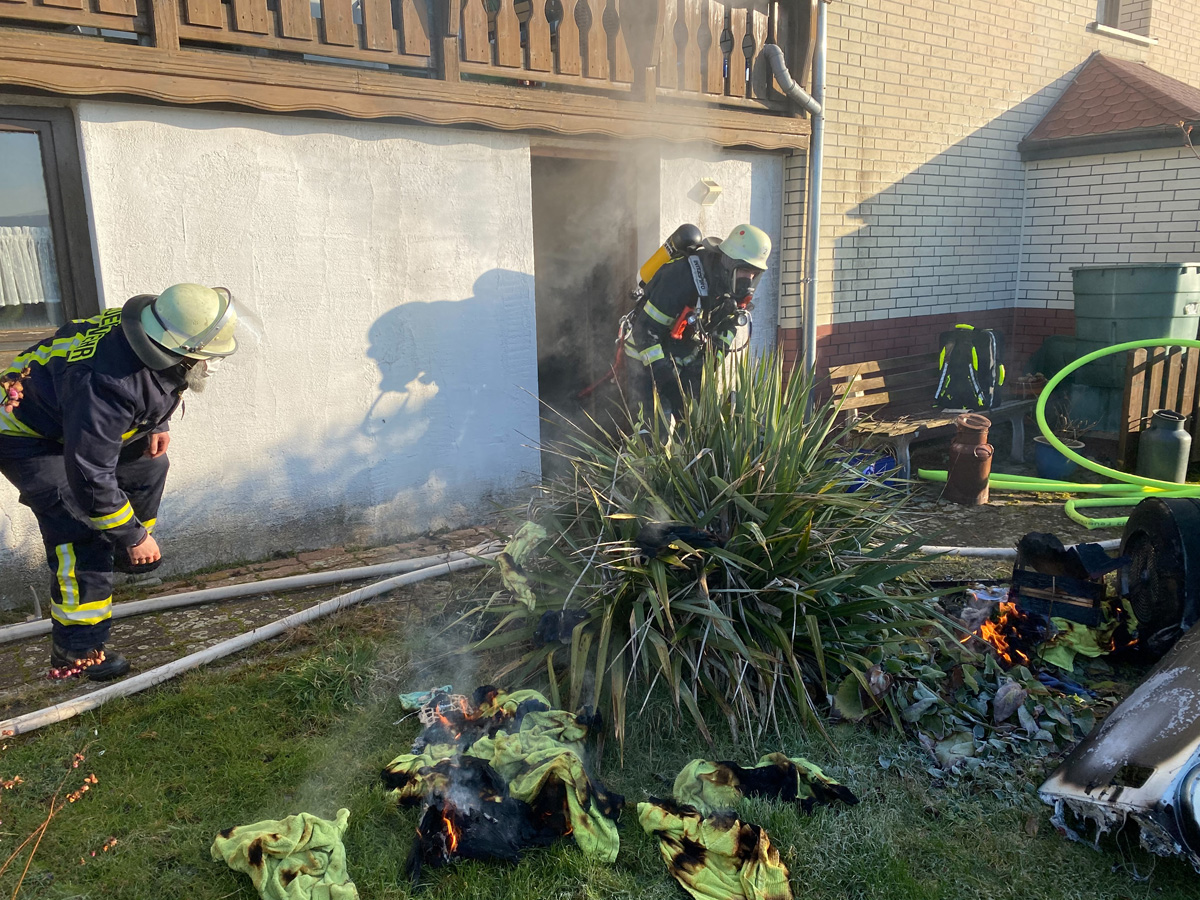 Beim Eintreffen der Einsatzkräfte aus den Löschbezirken Eppelborn und Bubach-Calmesweiler fanden diese einen komplett verrauchten Keller vor. Nachdem die Kellertür gewaltsam geöffnet worden war, drang ein mit umluftunabhängigem Atemschutz ausgerüsteter Trupp in den Keller vor und konnte nach kurzer Zeit die brennenden Überreste des Wäschetrockners ins Freie befördern. Während diese mit einem C-Rohr abgelöscht wurden, wurde ein weiteres Rohr im Keller vorgenommen, um letzte Glutnester zu löschen. Mit einer Wärmebildkamera wurde dann eine Nachkontrolle der Einsatzstelle durchgeführt.