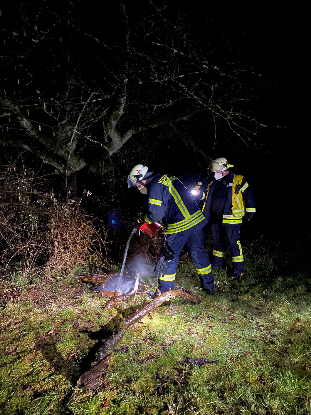 Um weitere Einsätze aufgrund des Feuers an diesem abgelegenen Ort zu vermeiden, wurde das Feuer mit dem Inhalt einer Kübelspritze abgelöscht.
