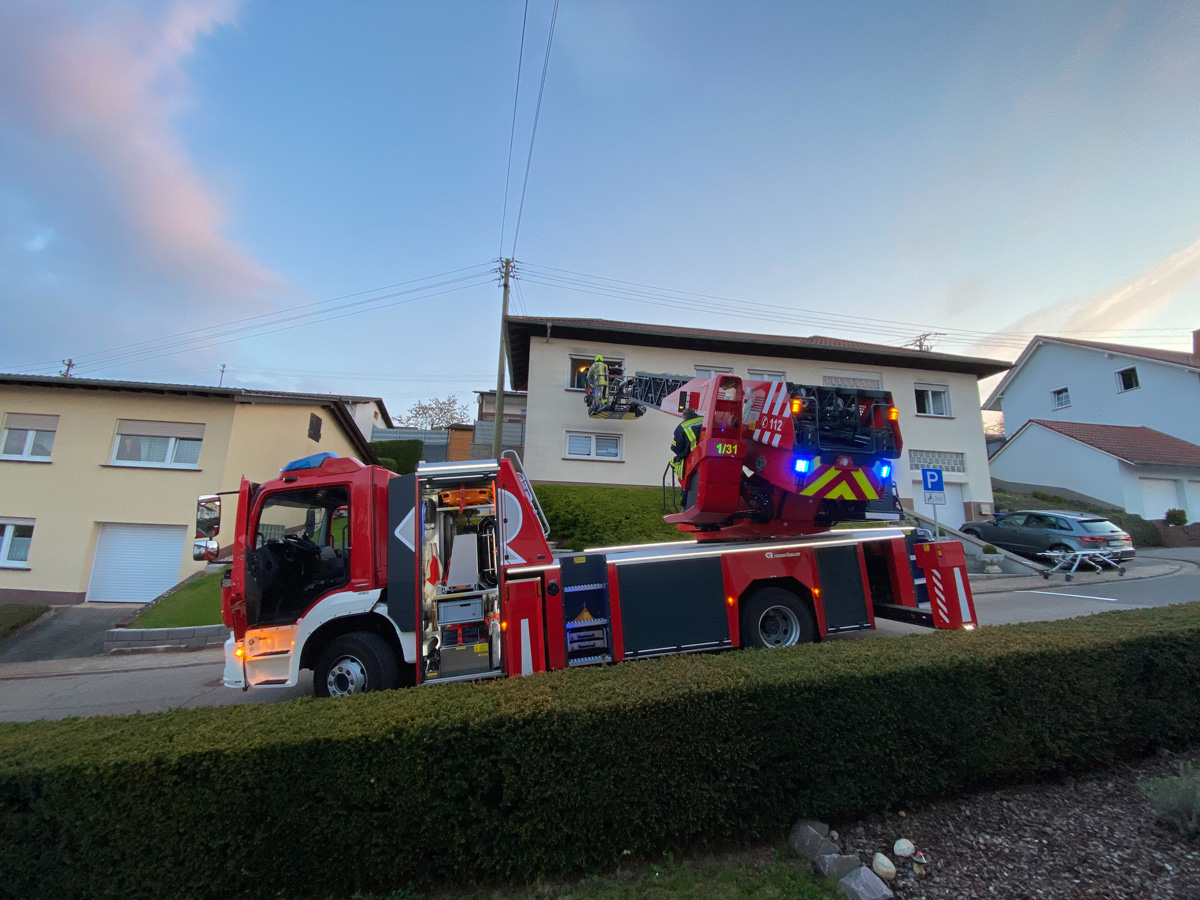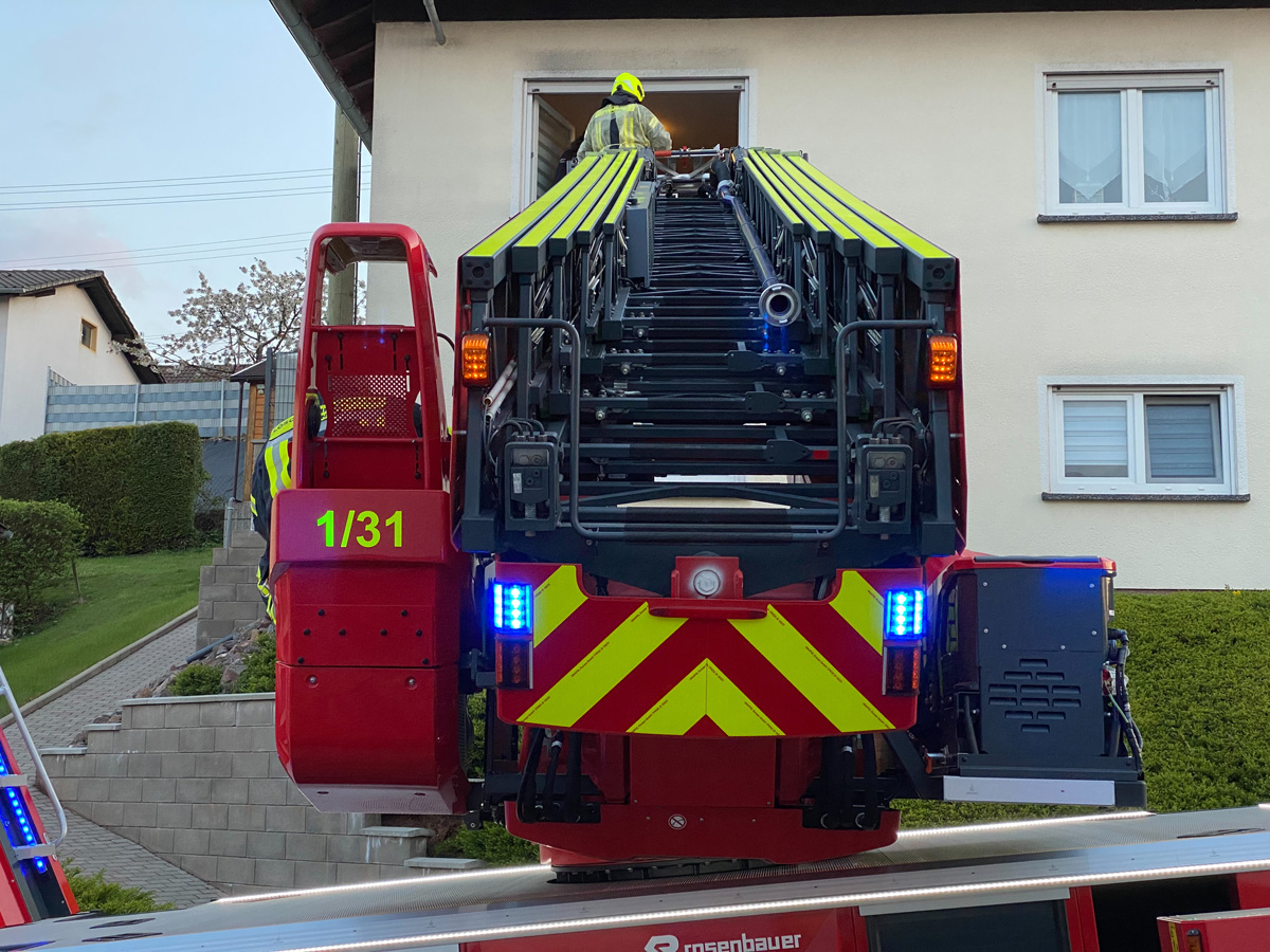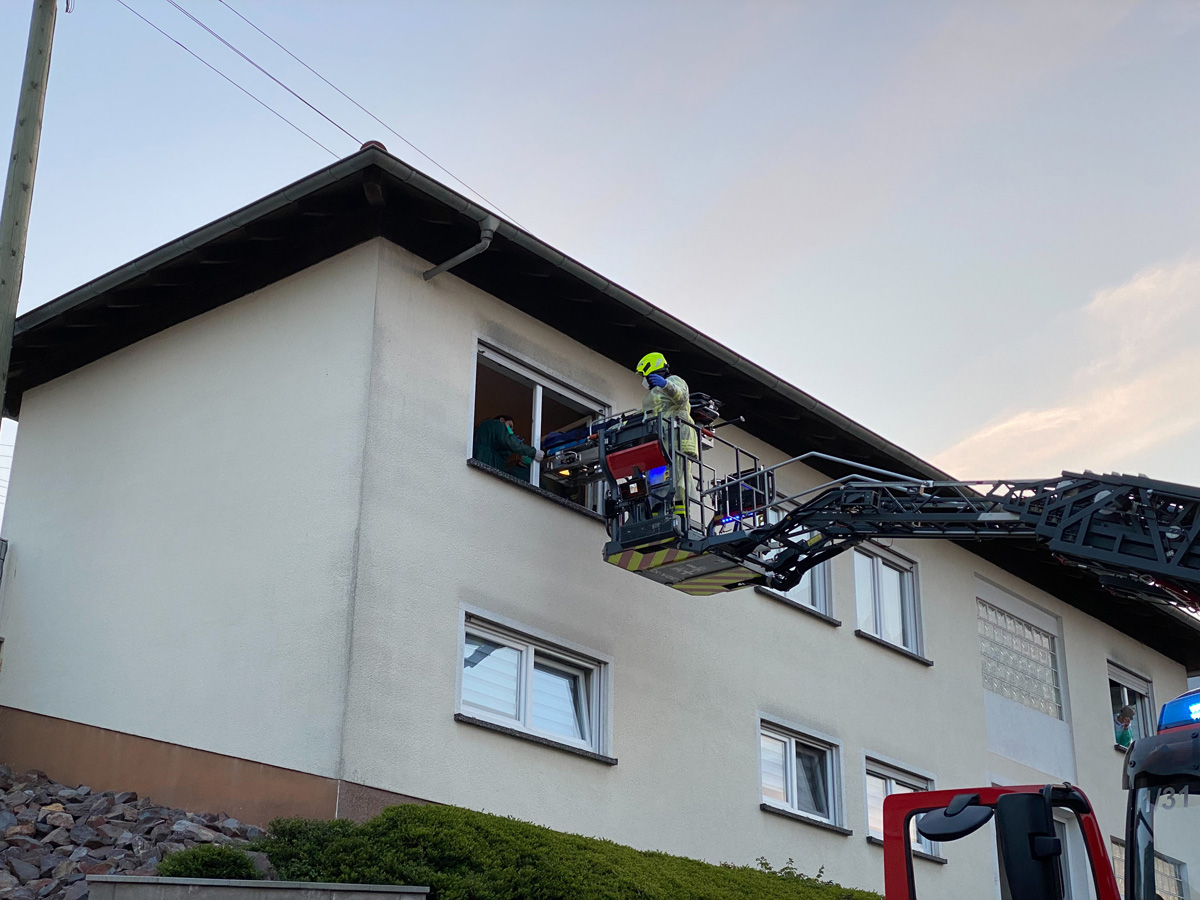 Bei einem gemeinsamen Einsatz von Rettungsdienst, Notarzt und der Feuerwehr wurde am Abend des 29. April 2021 ein Patient mit einer Drehleiter aus dem Obergeschoss eines Hauses im Wiesbacher Tannenweg gerettet.