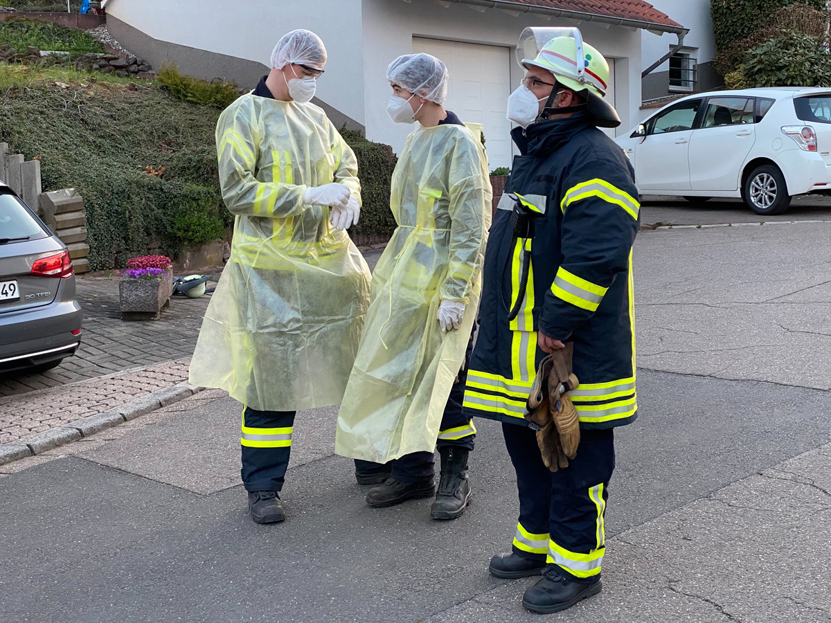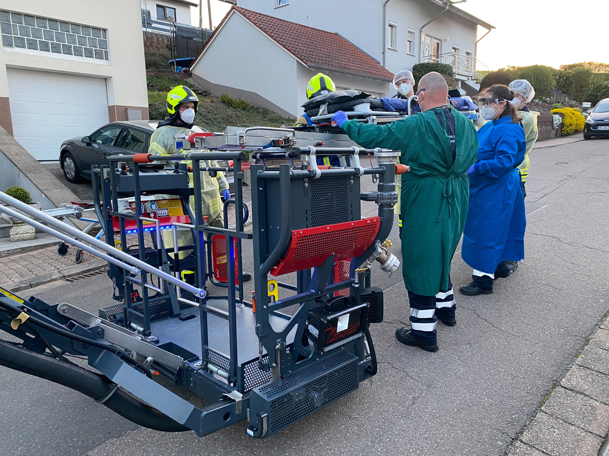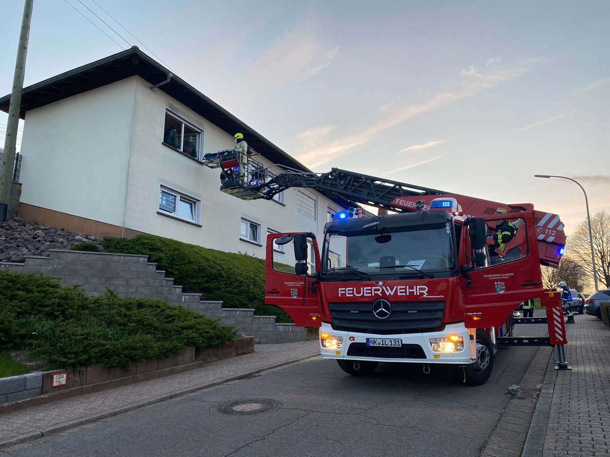 Der Patient konnte aufgrund seiner Erkrankung nur mittels einer Trage zum Rettungswagen transportiert werden – das ließ aber die Enge der Treppe, insbesondere aufgrund des dort verbauten Treppenliftes, nicht zu. Deshalb wurde die Drehleiter der Feuerwehr Illingen sowie der Löschbezirk Wiesbach vom Notarzt angefordert.