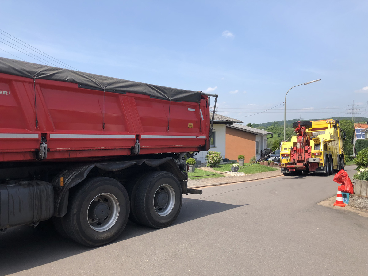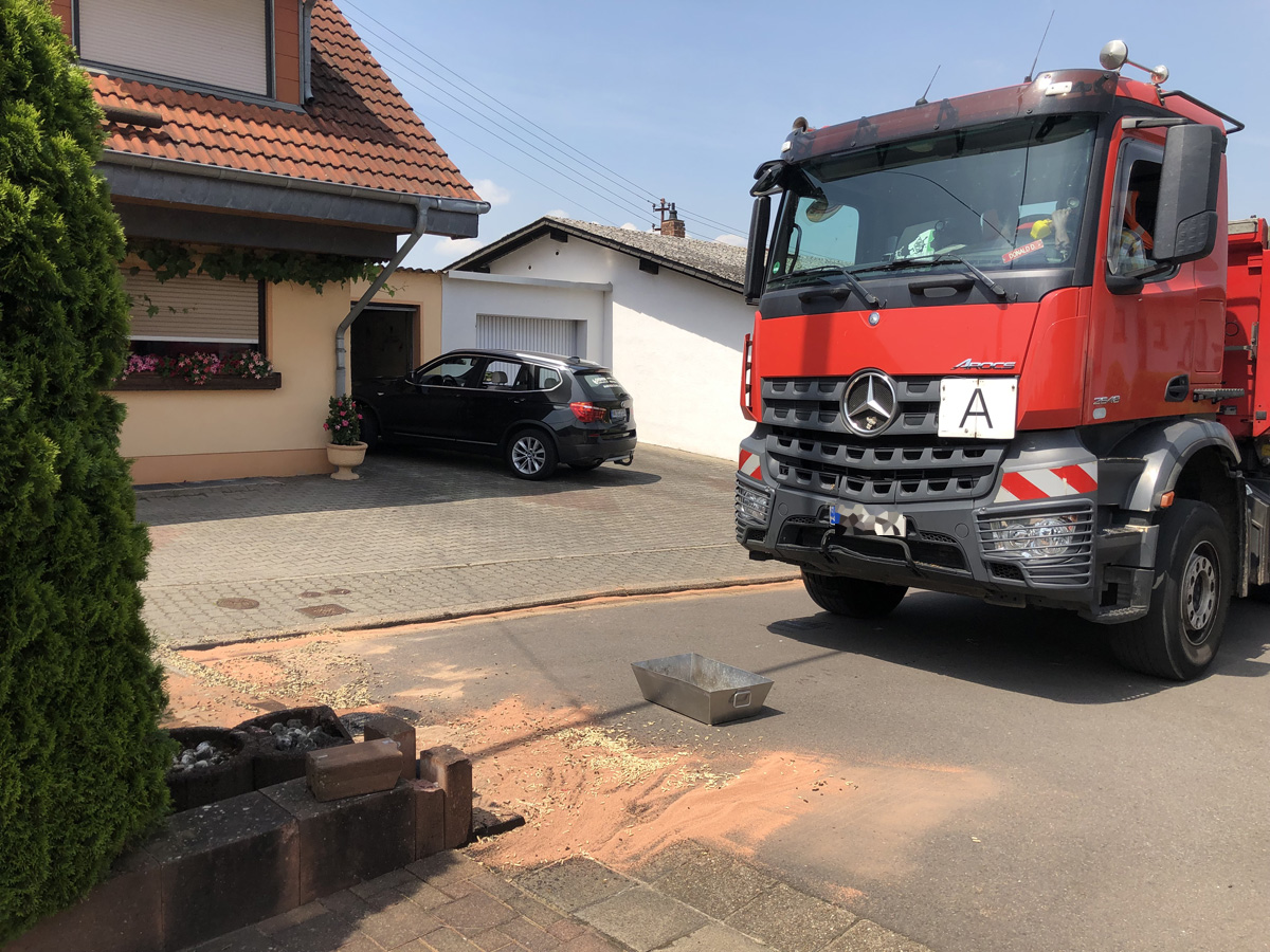 Zu einem langwierigen Einsatz wurde der Löschbezirk Wiesbach am 17. Juni 2021 alarmiert. In der Landstuhlstraße war ein Lkw gegen eine Mauer und einen Laternenpfosten gefahren. Dabei wurden Motor und Ölwanne beschädigt, so dass in Folge rund 40 Liter Motoröl austraten. Beim Eintreffen der Einsatzkräfte hatten Anwohner und ein Kommando der Polizei bereits einen Kanaleinlauf mit Rollsplitt abgedichtet. Trotzdem waren bereits circa 25 Liter in die Kanalisation gelaufen. Mit Bindemitteln wurde das restliche Motoröl aufgenommen und die Ölspur abgestreut. Der Entsorgungsverband wurde über den Öleintritt in die Kanalisation informiert. Der betroffene Laternenpfosten wurde mit einer Leine gesichert und der Energieversorger zur Einsatzstelle angefordert. Bevor der Lkw abgeschleppt werden konnte, mussten die mehr als 13 Tonnen Asphalt, die sich noch auf der Ladefläche befanden, umgeladen werden. Die Feuerwehr blieb bis zur Bergung an der Einsatzstelle. Zur Beseitigung der Ölverschmutzung wurde eine Fachfirma zur Einsatzstelle beordert. Der Einsatz war für die Feuerwehr gegen 14:20 beendet.