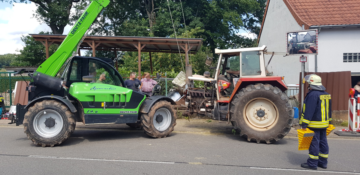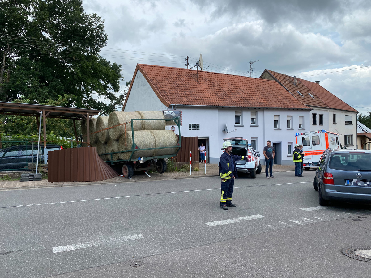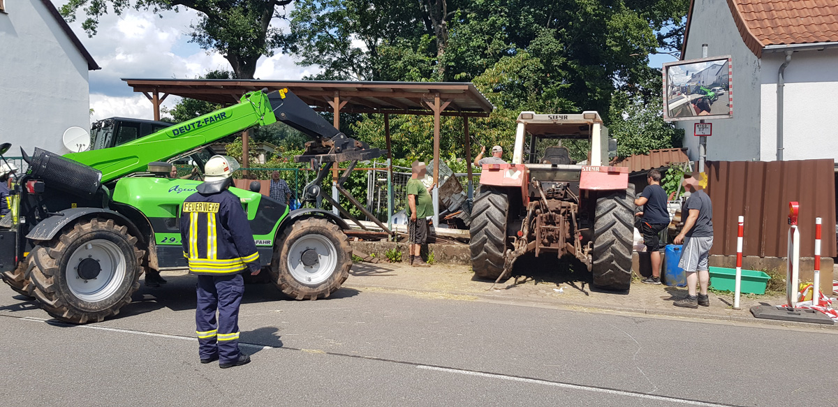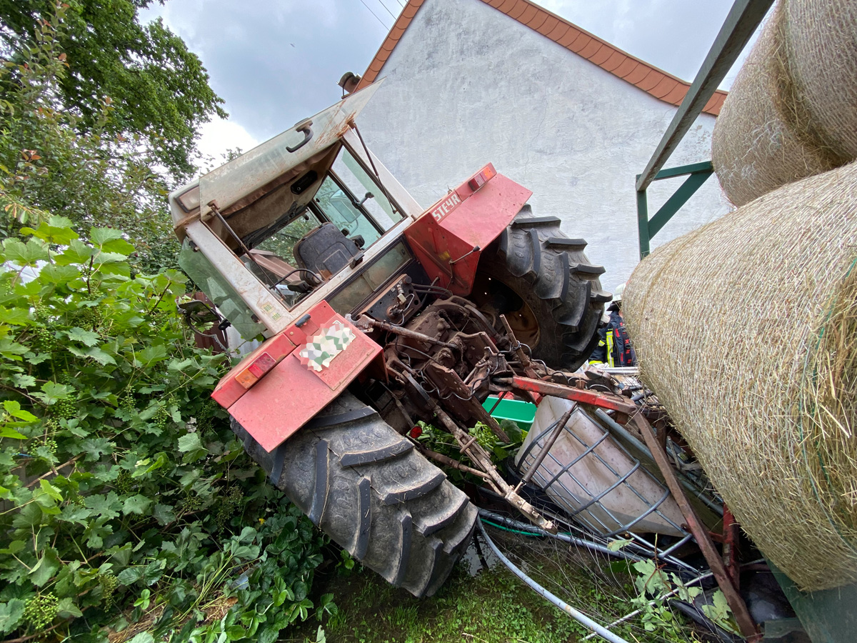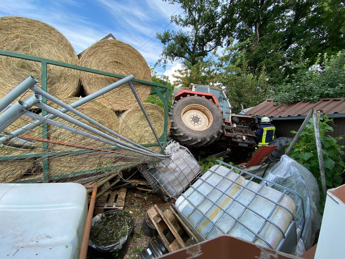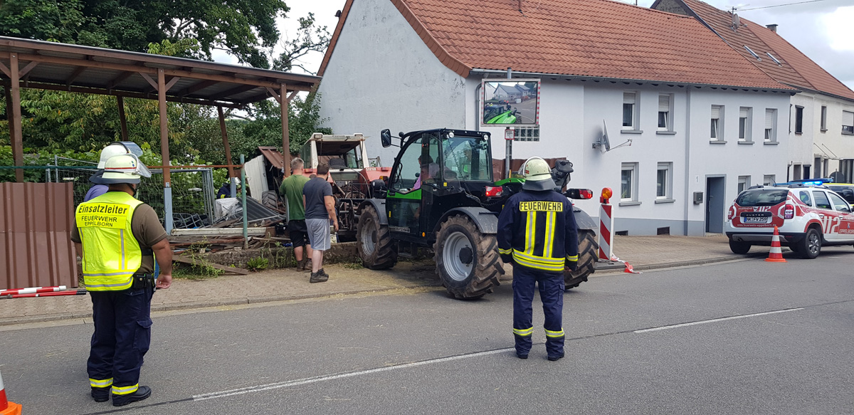 Gegen Mittag des 26. Juli 2021 kam es in der Illinger Straße im Ortsteil Bubach-Calmesweiler zu einem Verkehrsunfall. Ein mit rund 10 Tonnen Strohballen beladenes Traktorgespann schoss aus Richtung der abschüssigen Straße "Zum Hirschberg" über die B10 und prallte in einen auf der gegenüberliegenden Straßenseite stehenden Schuppen. Glücklicherweise erfasste er dabei weder Fußgänger noch andere Fahrzeuge auf der sonst vielbefahrenen Ortsdurchfahrt. Der Fahrer konnte sich noch aus eigener Kraft aus der Fahrerkabine des Traktors befreien und wurde von Anwohnern und Einsatzkräften der Feuerwehr bis zum Eintreffen des Rettungsdienstes betreut. Die Feuerwehr aus dem Löschbezirk Bubach-Calmesweiler sicherte die Unfallstelle und nahm auslaufende Betriebsstoffe auf. Befreundete Landwirte entluden mit schwerem Gerät den Anhänger. Die Bergung des Unfallfahrzeugs wurde von den Landwirten in Eigenregie organisiert. Um sie dabei zu unterstützen, wurde auch der Rüstwagen aus dem Löschbezirk Eppelborn nachgefordert. Der beschädigte Kraftstofftank des Traktors musste mit einer Handpumpe abgepumpt werden, um ein weiteres Austreten von Dieselkraftstoff zu verhinden. Der verletzte Fahrer musste nach einer Erstversorgung mit dem Rettungshubschrauber Christoph 16 zur weiteren Untersuchung und Behandlung in ein Krankenhaus geflogen werden. Unfallursache war offenbar ein technischer Defekt am Zugfahrzeug. Die Ortsdurchfahrt Bubach-Calmesweiler musste während der Bergungsarbeiten zeitweise voll gesperrt werden, der Verkehr wurde umgeleitet. Es entstand Sachschaden in noch unbekannter Höhe. Traktor und Anhänger sind nach dem Unfall wohl Totalschaden.