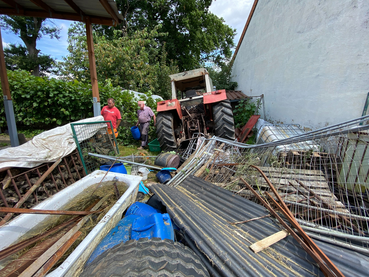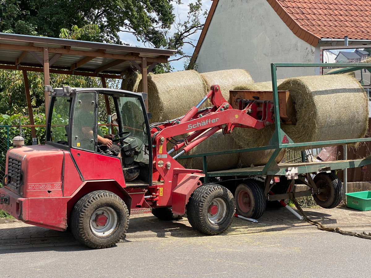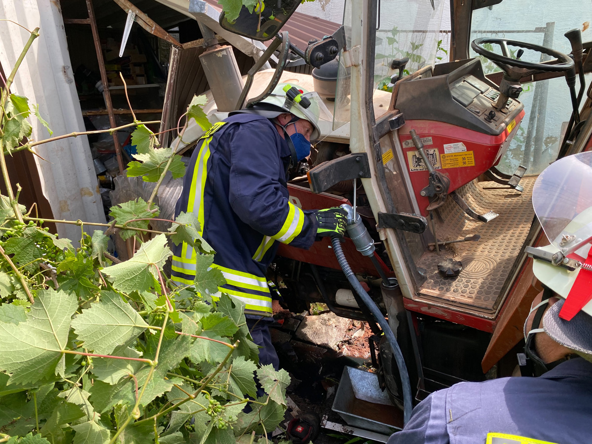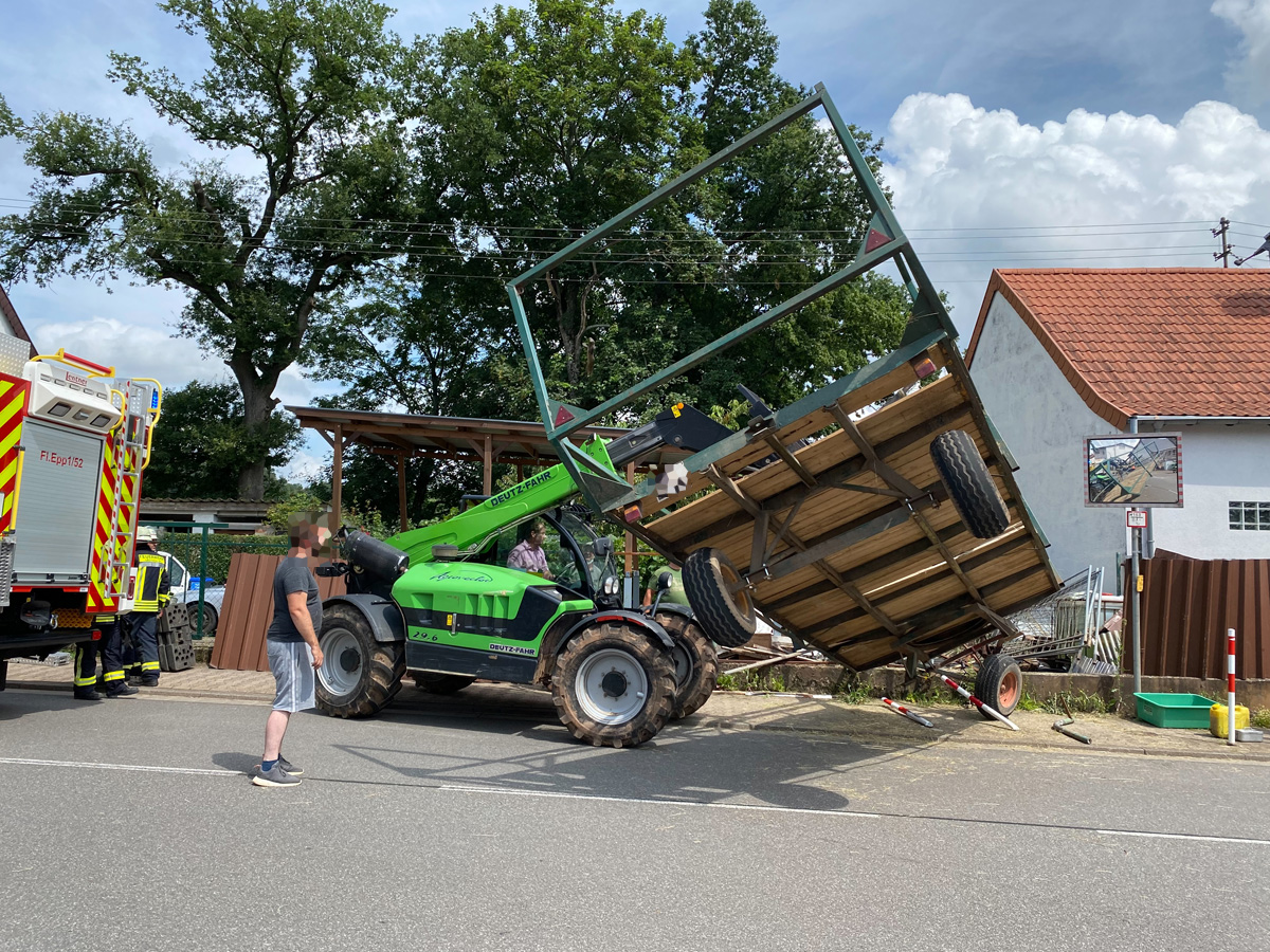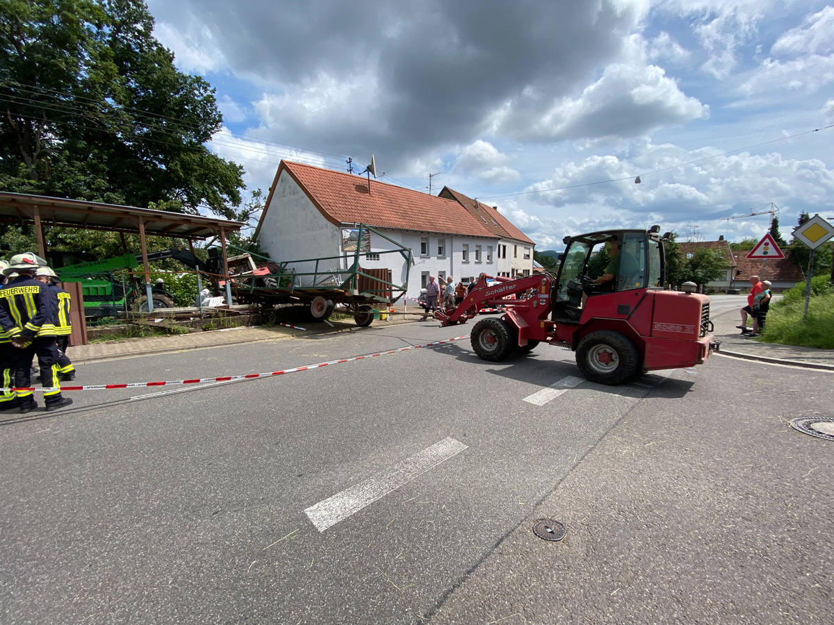 Gegen Mittag des 26. Juli 2021 kam es in der Illinger Straße im Ortsteil Bubach-Calmesweiler zu einem Verkehrsunfall. Ein mit rund 10 Tonnen Strohballen beladenes Traktorgespann schoss aus Richtung der abschüssigen Straße "Zum Hirschberg" über die B10 und prallte in einen auf der gegenüberliegenden Straßenseite stehenden Schuppen. Glücklicherweise erfasste er dabei weder Fußgänger noch andere Fahrzeuge auf der sonst vielbefahrenen Ortsdurchfahrt. Der Fahrer konnte sich noch aus eigener Kraft aus der Fahrerkabine des Traktors befreien und wurde von Anwohnern und Einsatzkräften der Feuerwehr bis zum Eintreffen des Rettungsdienstes betreut. Die Feuerwehr aus dem Löschbezirk Bubach-Calmesweiler sicherte die Unfallstelle und nahm auslaufende Betriebsstoffe auf. Befreundete Landwirte entluden mit schwerem Gerät den Anhänger. Die Bergung des Unfallfahrzeugs wurde von den Landwirten in Eigenregie organisiert. Um sie dabei zu unterstützen, wurde auch der Rüstwagen aus dem Löschbezirk Eppelborn nachgefordert. Der beschädigte Kraftstofftank des Traktors musste mit einer Handpumpe abgepumpt werden, um ein weiteres Austreten von Dieselkraftstoff zu verhinden. Der verletzte Fahrer musste nach einer Erstversorgung mit dem Rettungshubschrauber Christoph 16 zur weiteren Untersuchung und Behandlung in ein Krankenhaus geflogen werden. Unfallursache war offenbar ein technischer Defekt am Zugfahrzeug. Die Ortsdurchfahrt Bubach-Calmesweiler musste während der Bergungsarbeiten zeitweise voll gesperrt werden, der Verkehr wurde umgeleitet. Es entstand Sachschaden in noch unbekannter Höhe. Traktor und Anhänger sind nach dem Unfall wohl Totalschaden.