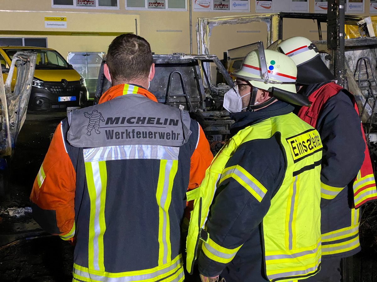 Drei Fahrzeuge brannten vollständig aus, ein weiteres wurden durch die Hitze erheblich beschädigt. Postsendungen befanden sich nicht in den Fahrzeugen. Die Polizei hat die Ermittlungen zur Entstehungsursache aufgenommen. Der Einsatz der Feuerwehr dauert bis kurz nach 6:00 Uhr am Morgen, das Wiederherstellen der Einsatzbereisschaft dauert bis gegen 08:00 Uhr.