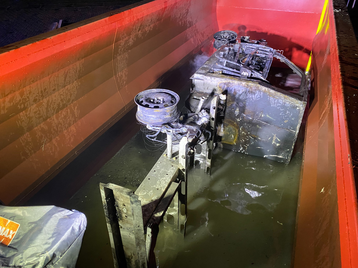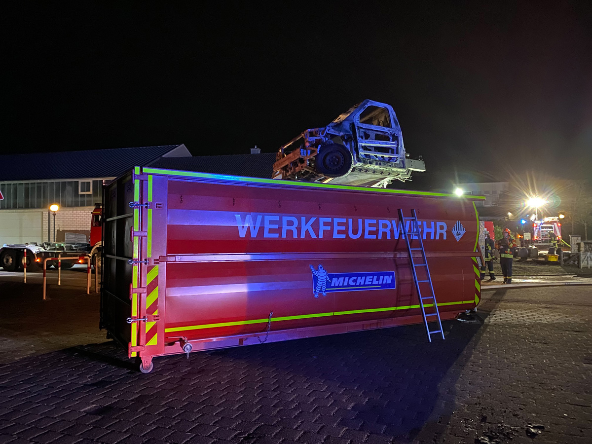 [left][cmsimg]11709[/cmsimg][/left]Aus diesem Grund müssen Akkus von Elektrofahrzeugen nach einem Brand intensiv gekühlt werden. Dazu wurde von der Michelin Werkfeuerwehr in Homburg ein Abrollbehälter Wassermulde angefordert. Diesen hatte die Werkfeuerwehr extra für etwaige Bränden von Elektrostaplern auf dem Werksgelände beschafft. In diesen Container wurden die Fahrzeuge mit einem Radlader des Gemeindebauhofs verbracht und dieser dann mit Wasser geflutet, um die entstehende Wärme abzuführen. Dort müssen die Fahrzeuge jetzt zwei bis drei Tage verbleiben, bevor sie einer Entsorgung zugeführt werden können.
