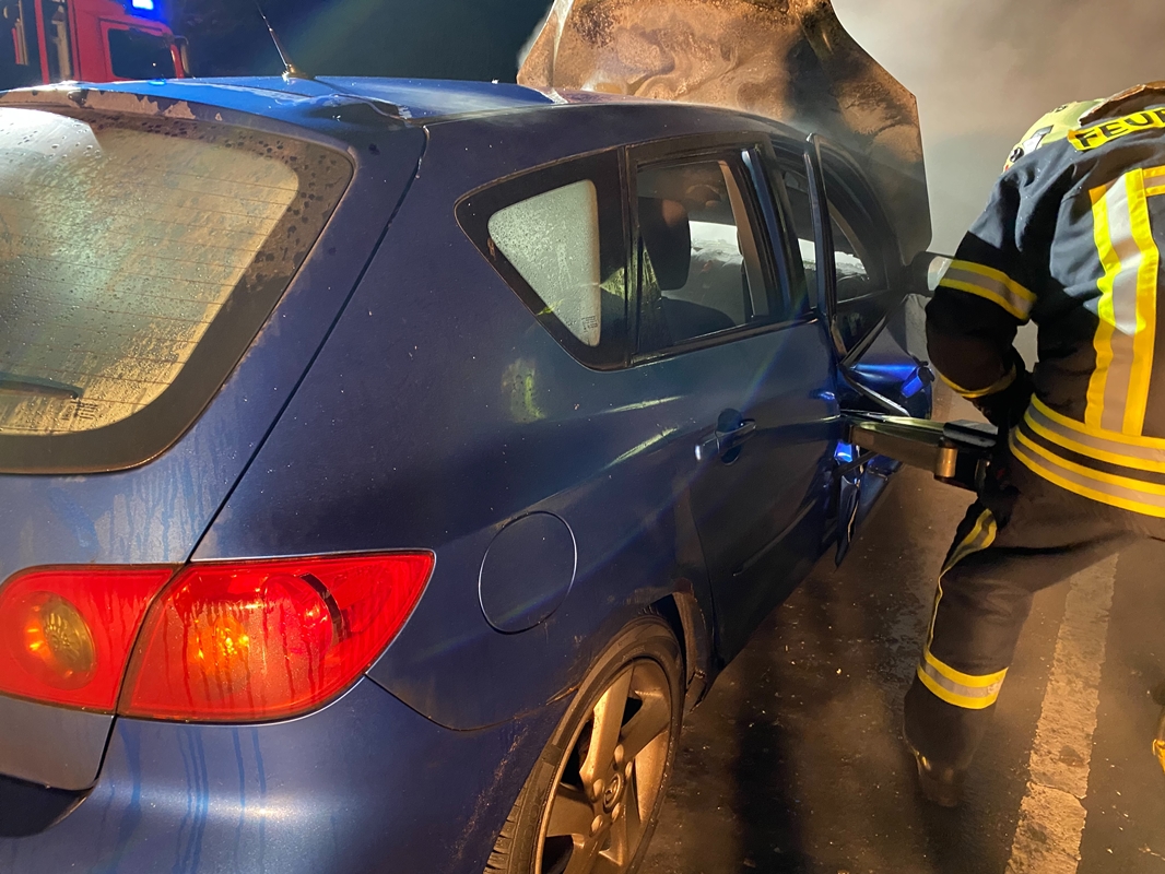 Schnell konnte das Feuer unter Kontrolle gebracht werden. Da sich durch die enorme Hitze die Tür- und Motorhauben Entriegelung nicht mehr bedienen ließen, musste sich mit einer hydraulischen Rettungsschere und einem Spreizer Zugang verschafft werden.
