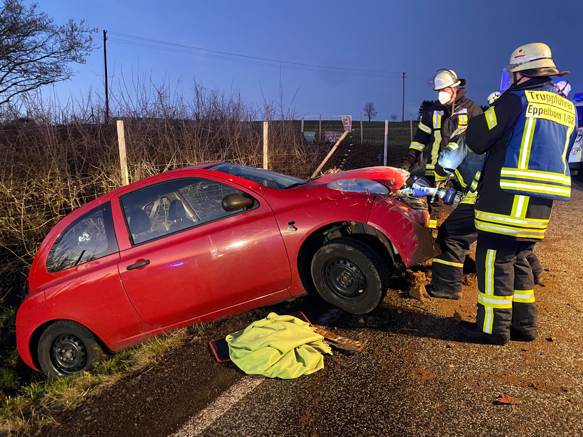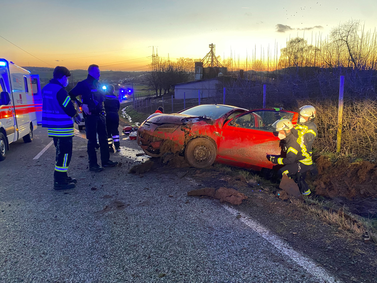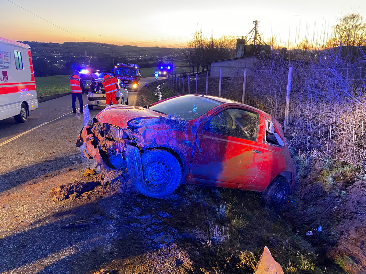 Am Abend des 07. Februar befuhr eine Fahrzeugführerin mit ihrem Kleinwagen die L 141 von Humes in Richtung Wallenbornstraße im Ortsteil Wiesbach. Aus noch ungeklärter Ursache verlor sie dann auf Höhe des landwirtschaftlichen Betriebes "Wackenberger Hof" die Kontrolle über ihr Fahrzeug und kam nach rechts von der Fahrbahn ab. Hierbei geriet sie in einen tiefen Straßengraben.
