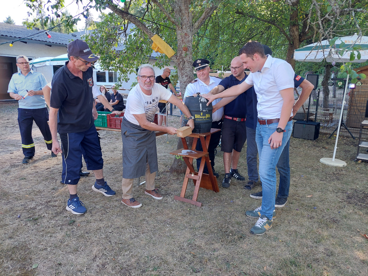 Nun stand die große Aufgabe im Raum das 30 Liter Eröffnungsfass anzuschlagen. Diese Arbeit übernahmen der 1. Beigeordnete Christian Ney, sowie der stellvertretende Ortsvorsteher Michael Polotzek. Das Fass sträubte sich vehement den Zapfhahn in sich auf zu nehmen. Michael Polotzek, ein geübter Handwerker, versuchte sein bestes, doch das Fass wollte nicht. Schließlich gelang es dennoch und das kühle Nass floss in die Krüge. Diese wurden dann ,unter Applaus, von der Löschbezirksführung an die Gäste verteilt. Der Startschuss für zwei tolle Tage bei der Feuerwehr war gefallen.