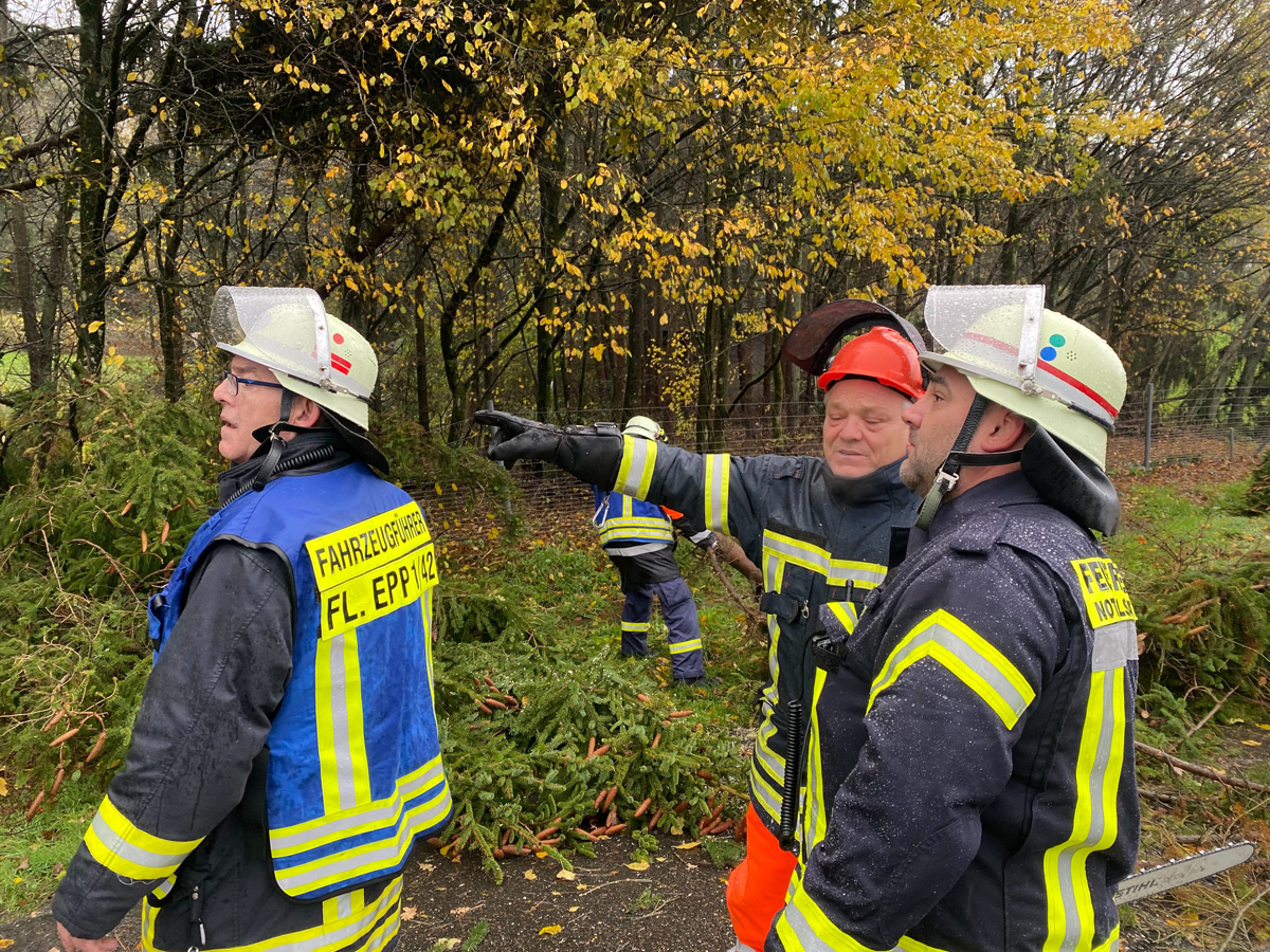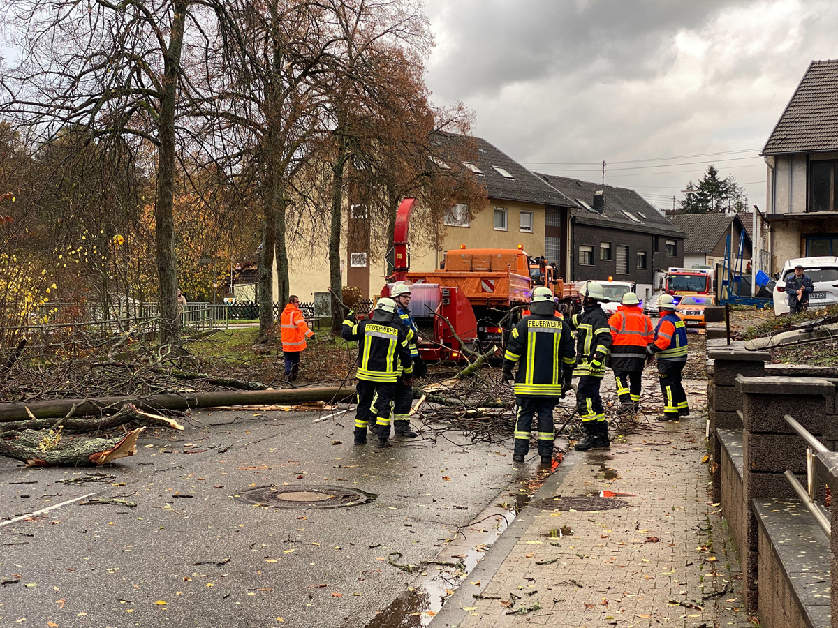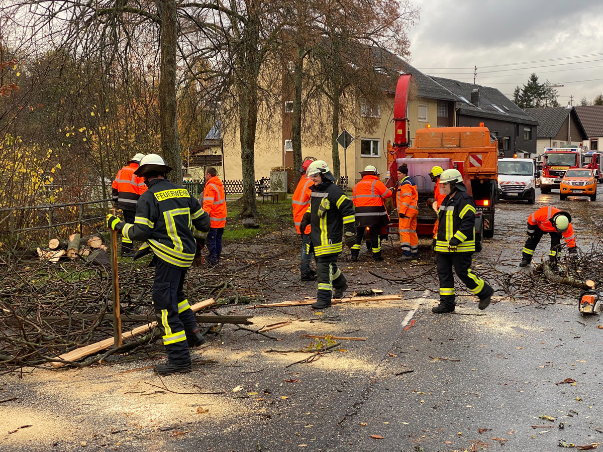 In kurzem Abstand wurde deshalb Alarm für die Löschbezirke Dirmingen, Eppelborn, Bubach-Calmesweiler und Humes-Hierscheid ausgelöst. Zusammen mit Mitarbeitern des Baubetriebshofes der Gemeinde wurden die umgestürzten Bäume mit Motorkettensäge zerteilt und wieder für freie Fahrt gesorgt.