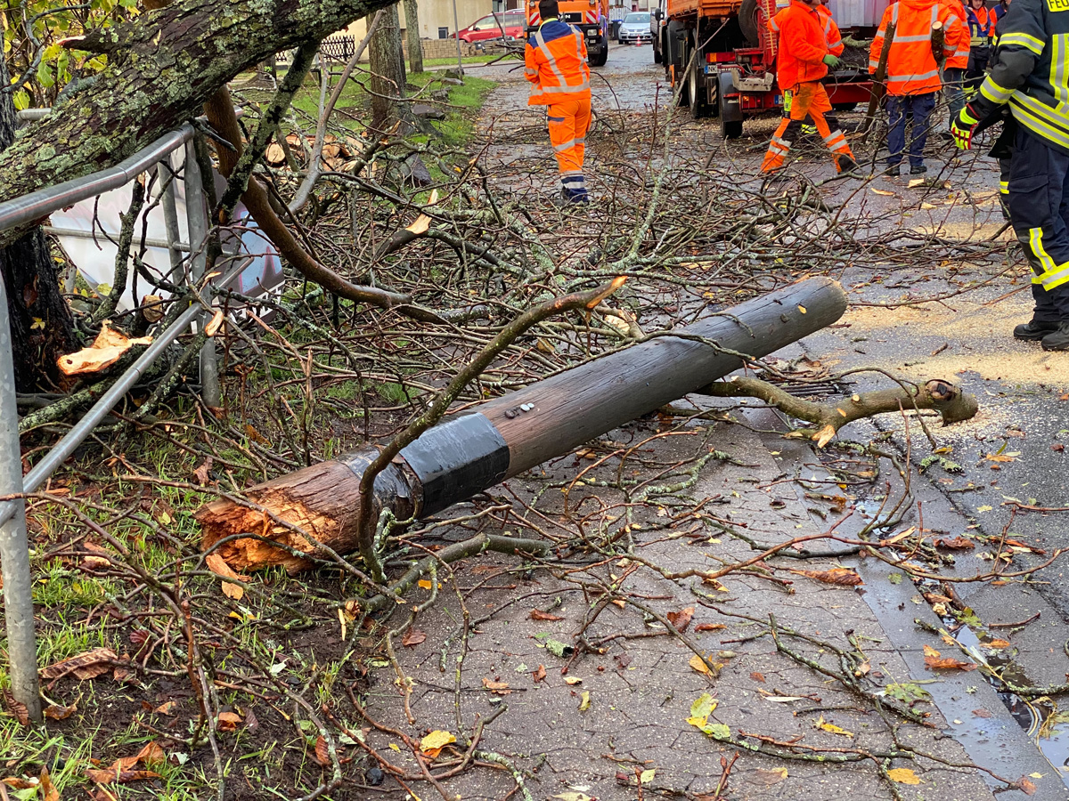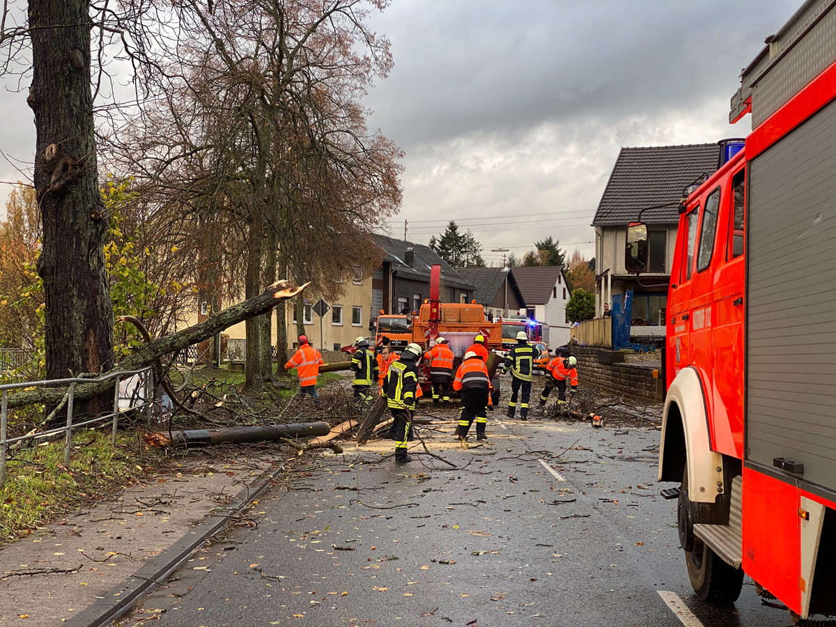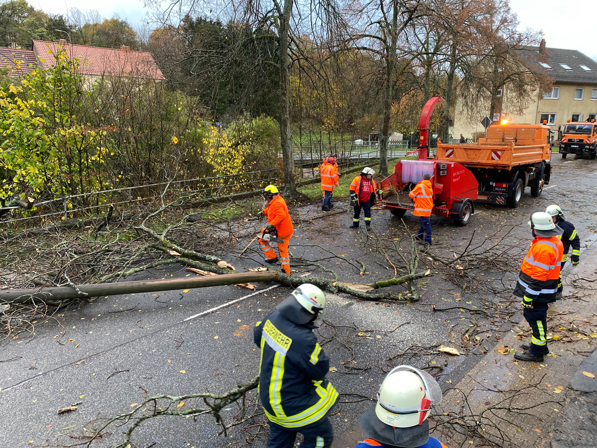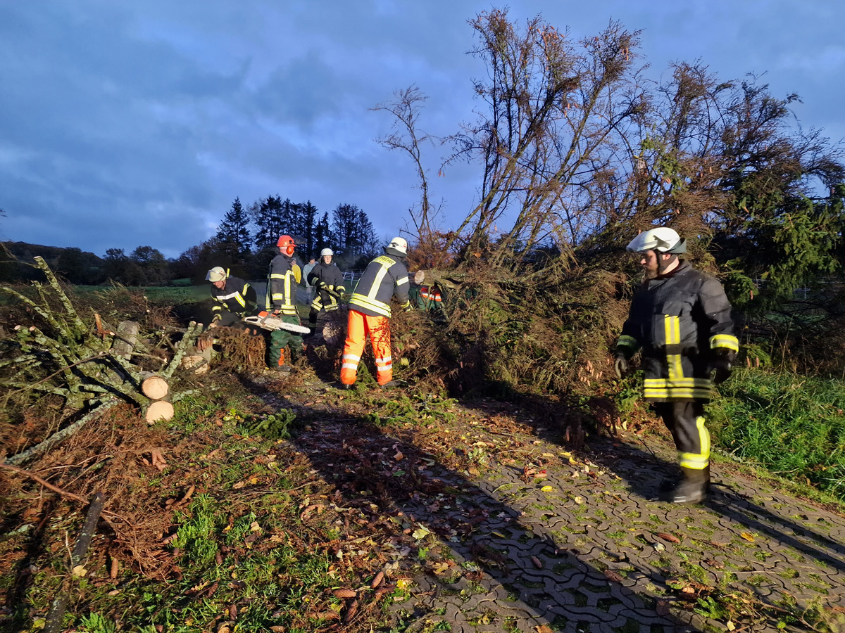 In kurzem Abstand wurde deshalb Alarm für die Löschbezirke Dirmingen, Eppelborn, Bubach-Calmesweiler und Humes-Hierscheid ausgelöst. Zusammen mit Mitarbeitern des Baubetriebshofes der Gemeinde wurden die umgestürzten Bäume mit Motorkettensäge zerteilt und wieder für freie Fahrt gesorgt.