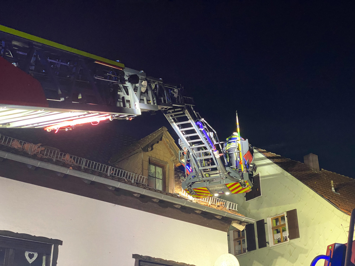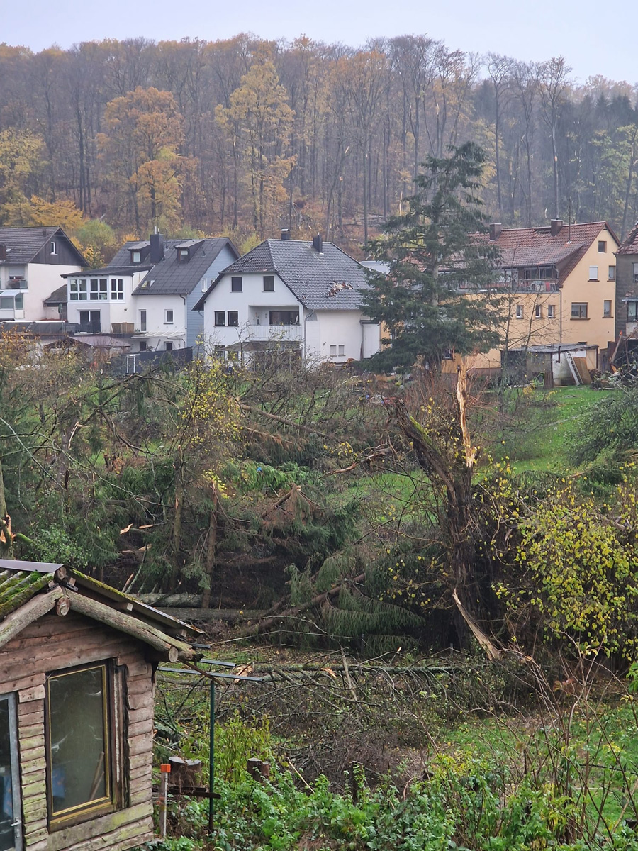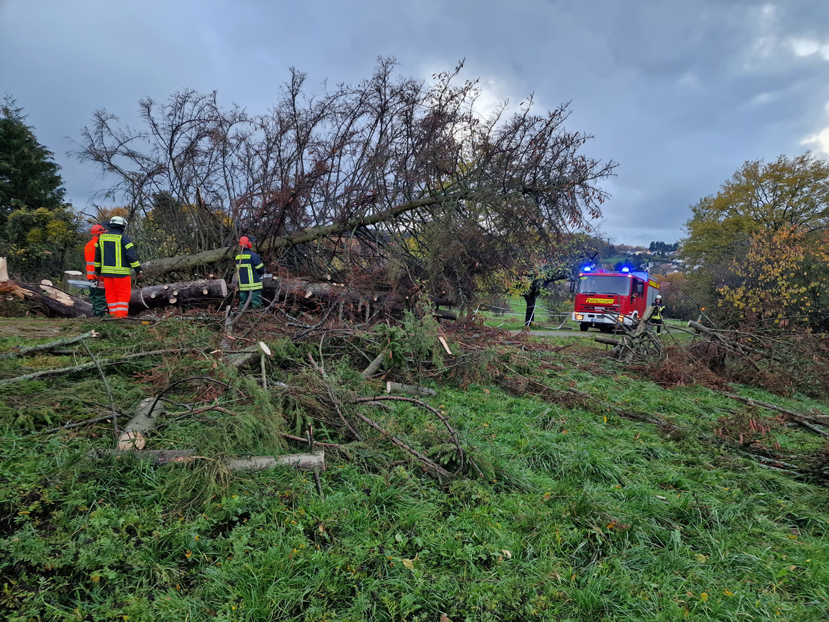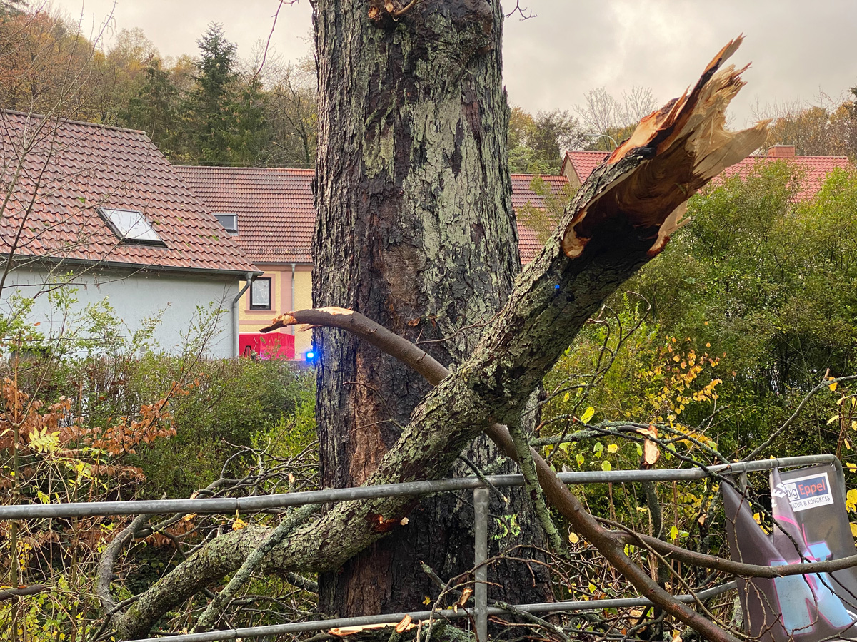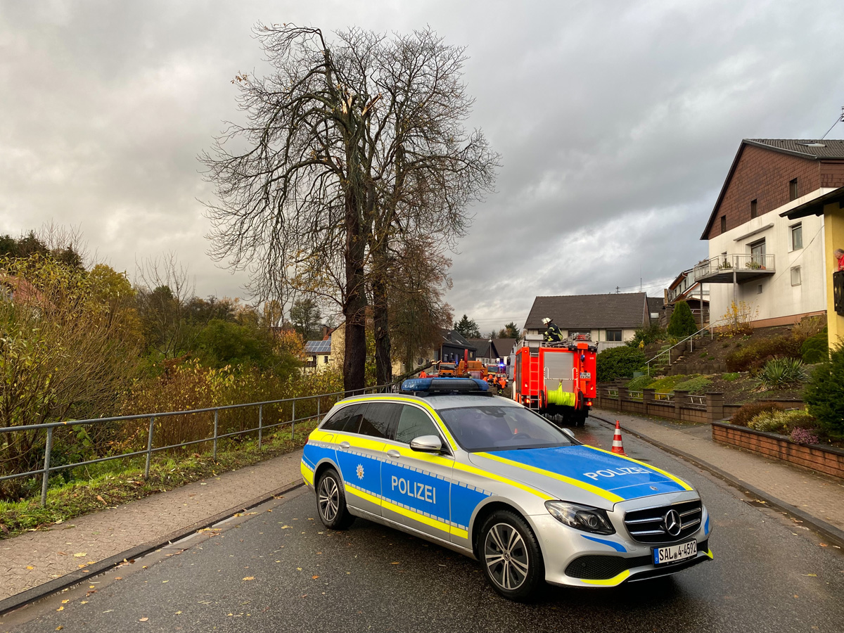 Ein Baum, der auf ein Wohnhaus zu stürzen drohte, konnte zusammen mit den Kameraden der Feuerwehr Illingen, die mit der Drehleiter vor Ort waren, beseitigt werden.