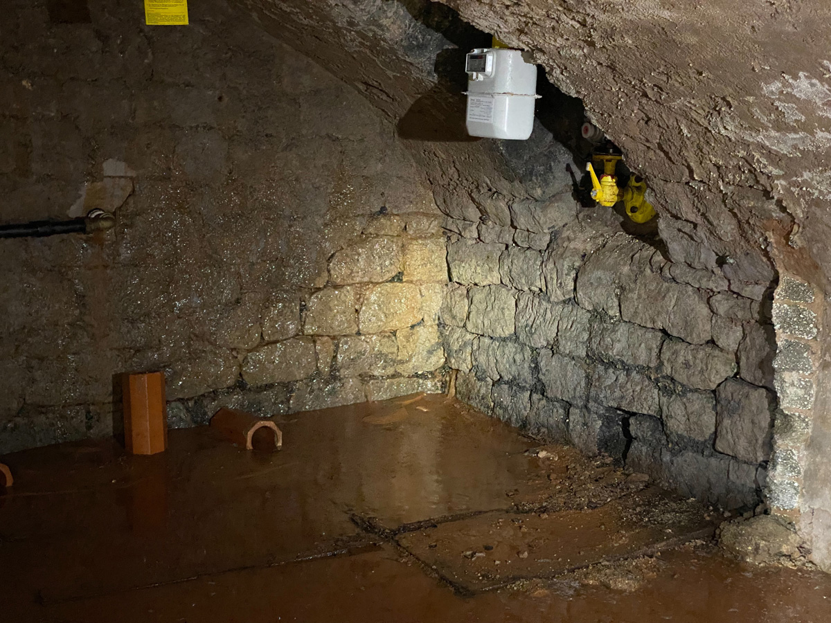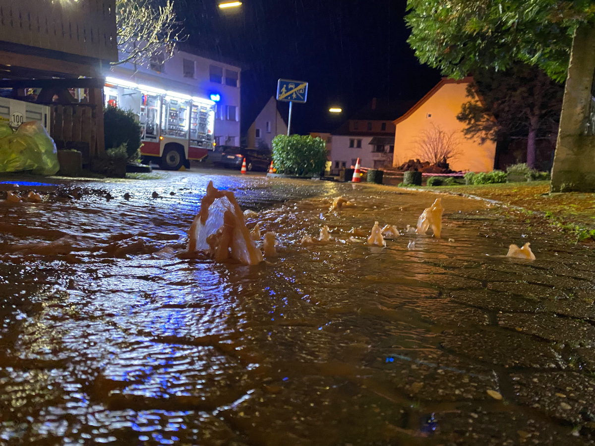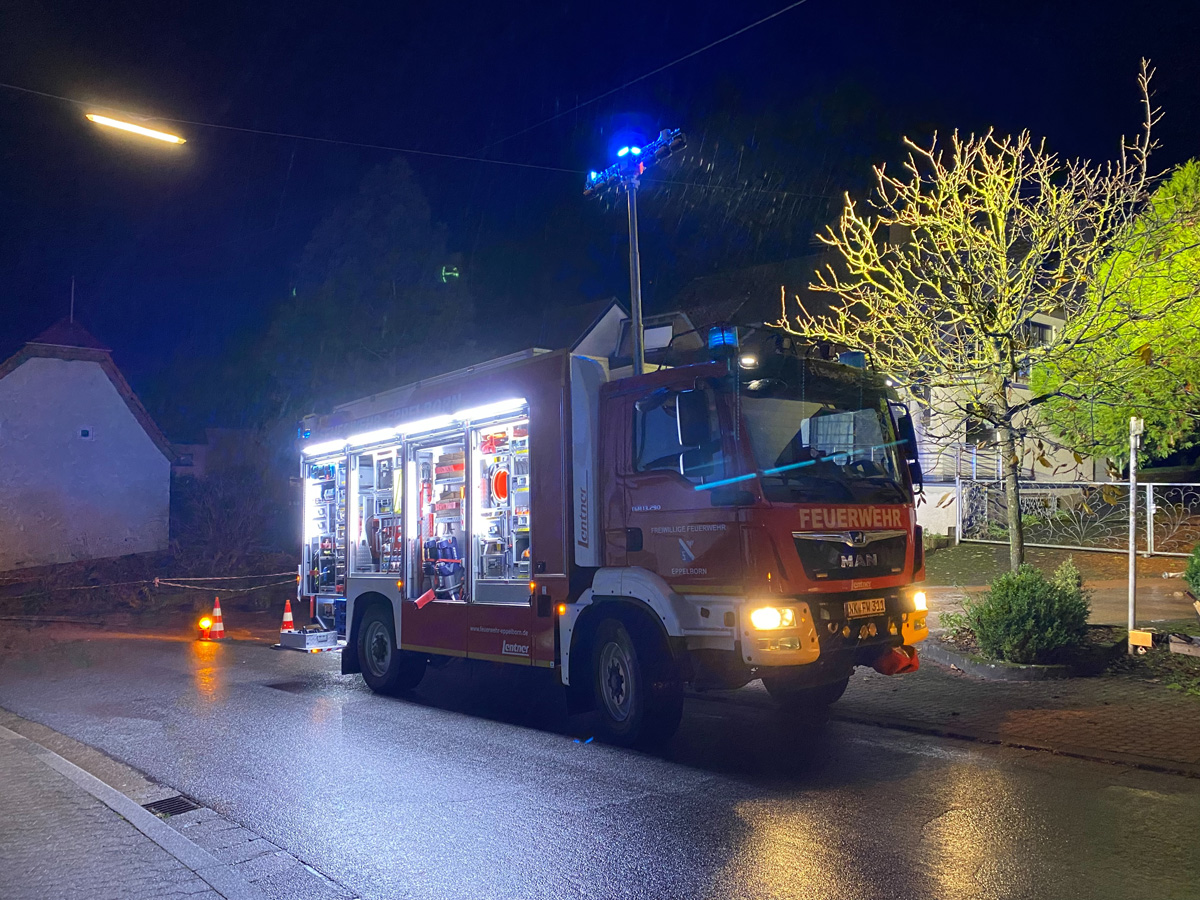 Die Feuerwehr aus dem Löschbezirk Eppelborn wurde am Morgen des 21. November 2022 gegen 02:07 Uhr von Anwohnern der Straße "Matzenberg" alarmiert, nachdem sie bemerkt hatten, dass ihr Keller gut 40cm unter Wasser stand. Bei der Anfahrt zur Einsatzstelle fiel den Einsatzkräften auf, dass Wasser an mehreren Stellen aus der gepflasterten Fahrbahn hervorquoll. Ein Stück des Gehweges hatte sich mehrere Zentimeter weit angehoben, zum Teil war der gepflasterte Straßenbelag eingesackt. Offenbar war die in der Straße verlaufende Hauptwasserleitung beschädigt und die Straße auf einer Länge von rund 30 Metern unterspült worden. Außerdem war Wasser von außen in den Keller eines Anwesens eingedrungen. Die Feuerwehr fordert den Wasserversorger nach, der den betroffenen Abschnitt der Wasserversorgung abstellte und richtete gemeinsam mit dem Baubetriebshof der Gemeinde Eppelborn eine Straßensperre ein. Der vollgelaufene Keller wurde mit einer Tauchpumpe leergepumpt. Die Reparaturarbeiten wird jetzt der Wasserversorger übernehmen. Der Einsatz war für die Feuerwehr nach rund 2 Stunden beendet.