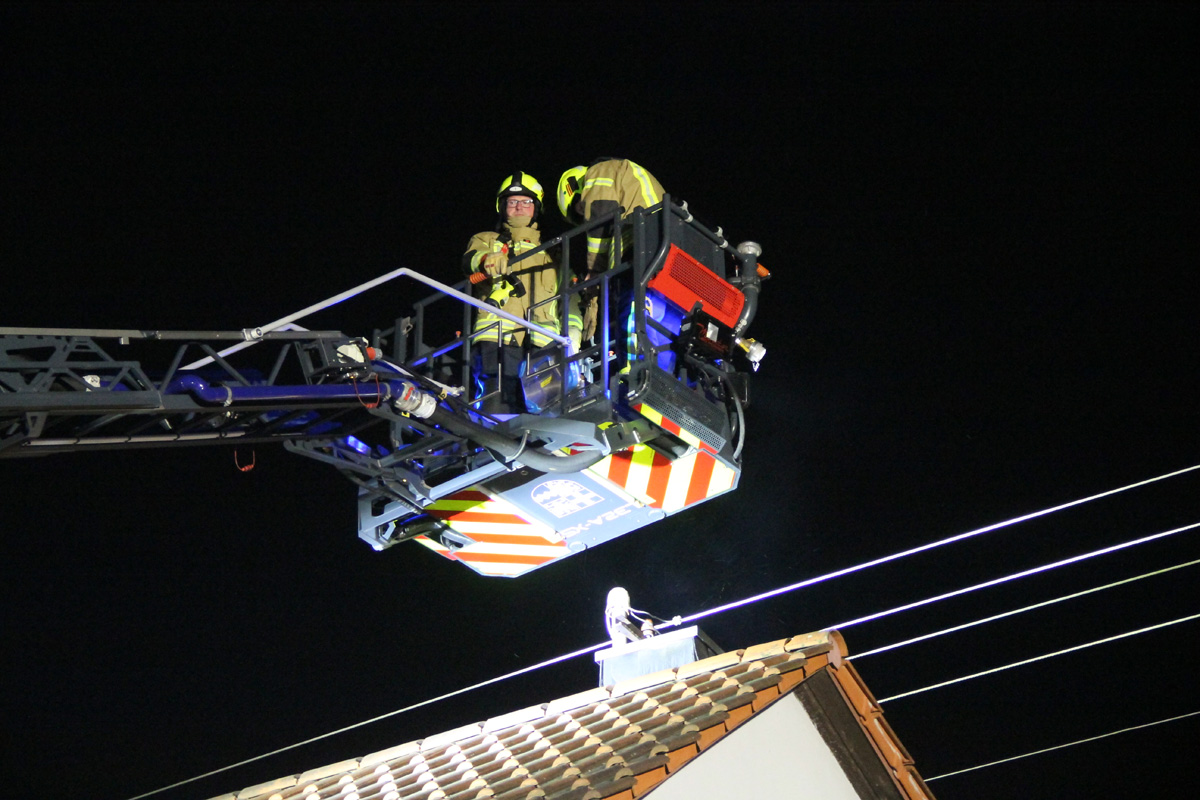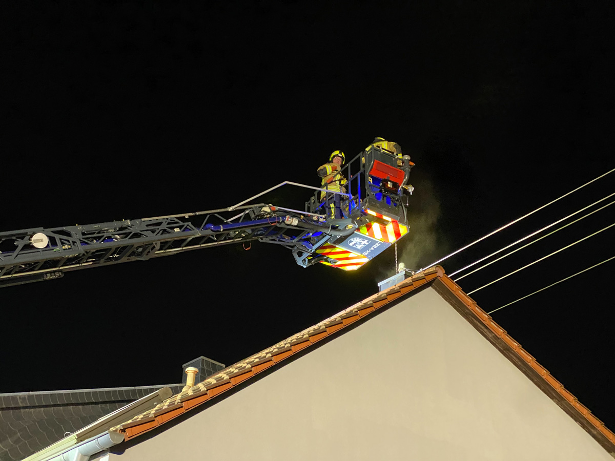 Bei Ankunft der Einsatzkräfte konnte ein starker Funkenflug aus dem Schornstein festgestellt werden. Die Bewohner hatten bereits das Haus verlassen. Bei der Erkundung konnte festgestellt werden, dass im oberen Bereich des Schornsteins, an dem ein Holzkamin angeschlossen war, Ablagerungen im Kamin brannten.