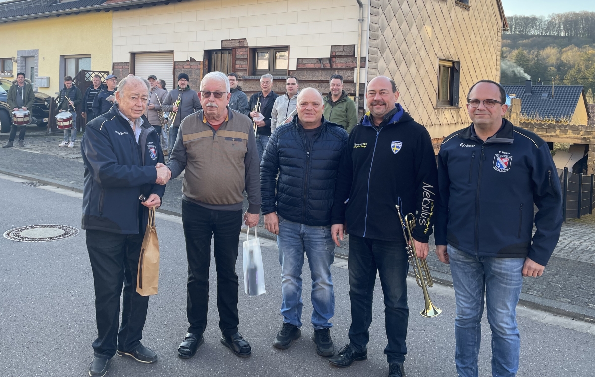 Der Fanfarenzug Eppelborn gratulierte mit einem Ständchen, auch der Löschbezirksführer und die Alterswehr schlossen sich der Gratulation an. Auch dirigierte das Geburtstagskind in gekonnter Manier ein Lied des Fanfarenzuges