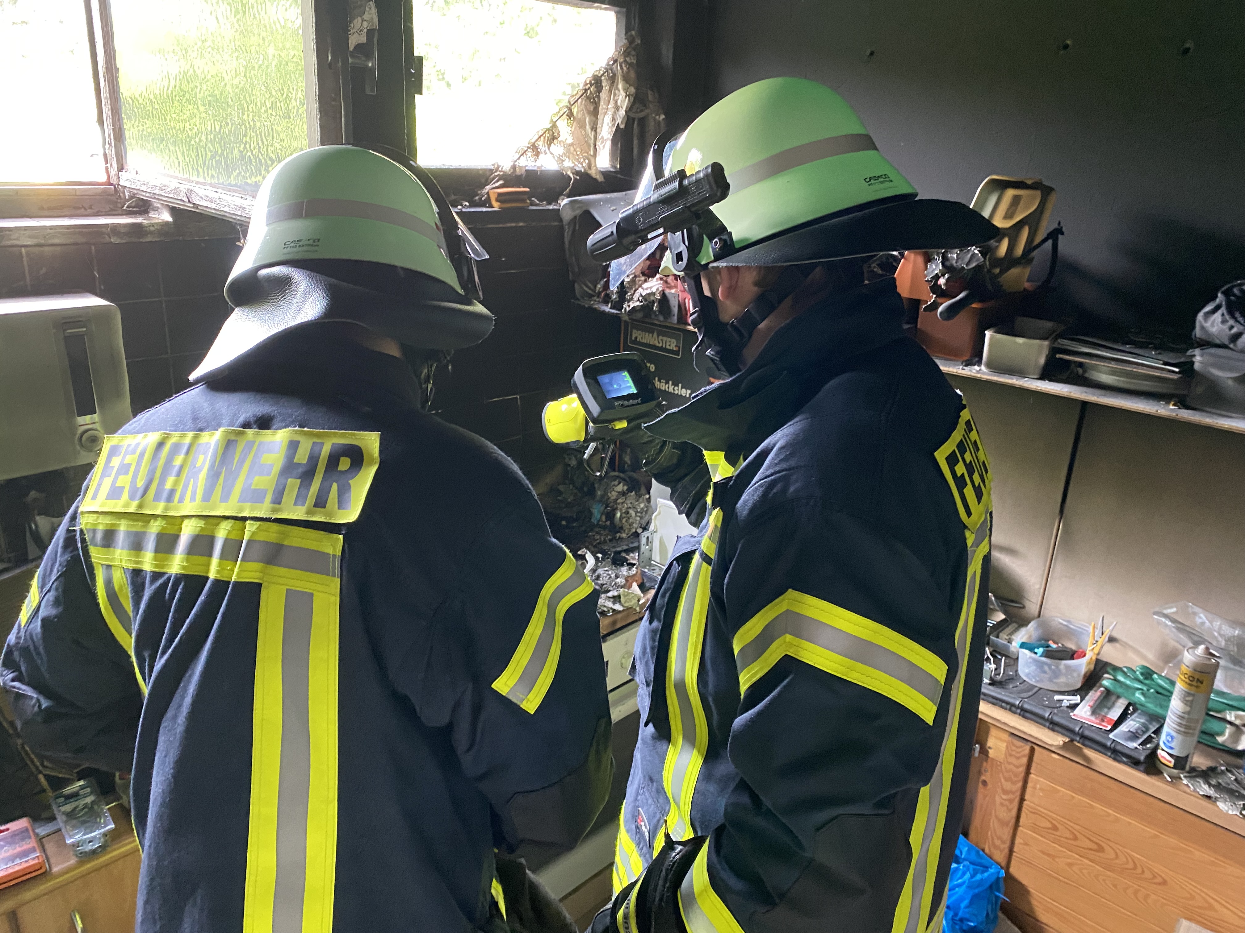 Nachdem der Anbau mit einem Überdrucklüfter rauchfrei geblasen wurde, wurde der Raum mit einer Wärmebildkamera kontrolliert. Dabei konnte ein eingeschalteter Herd festgestellt und abgeschaltet werden.