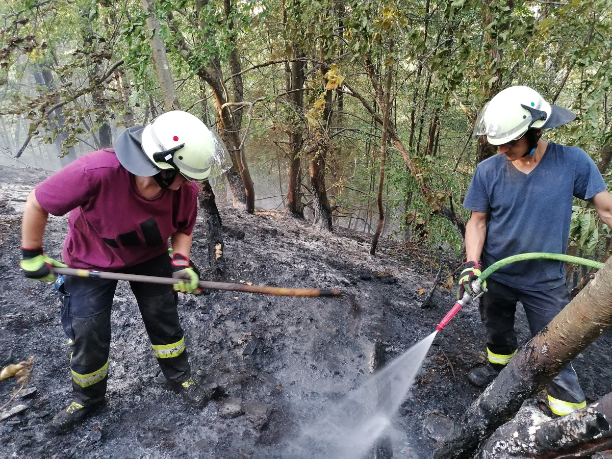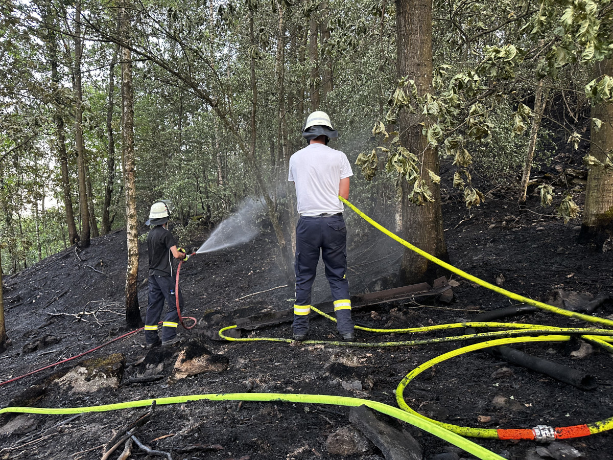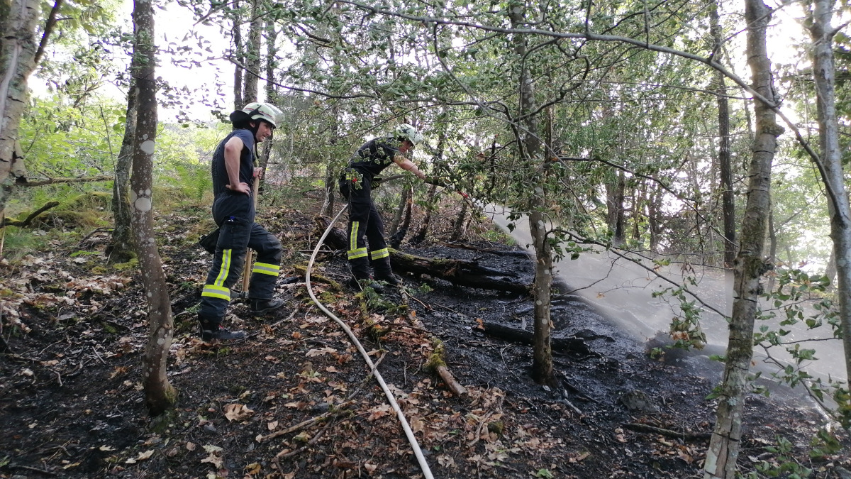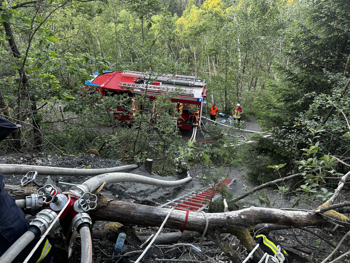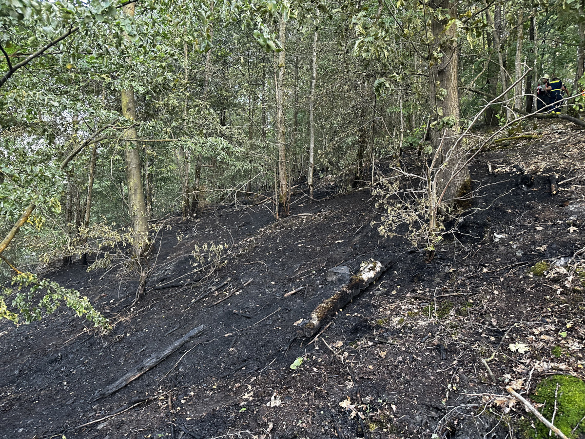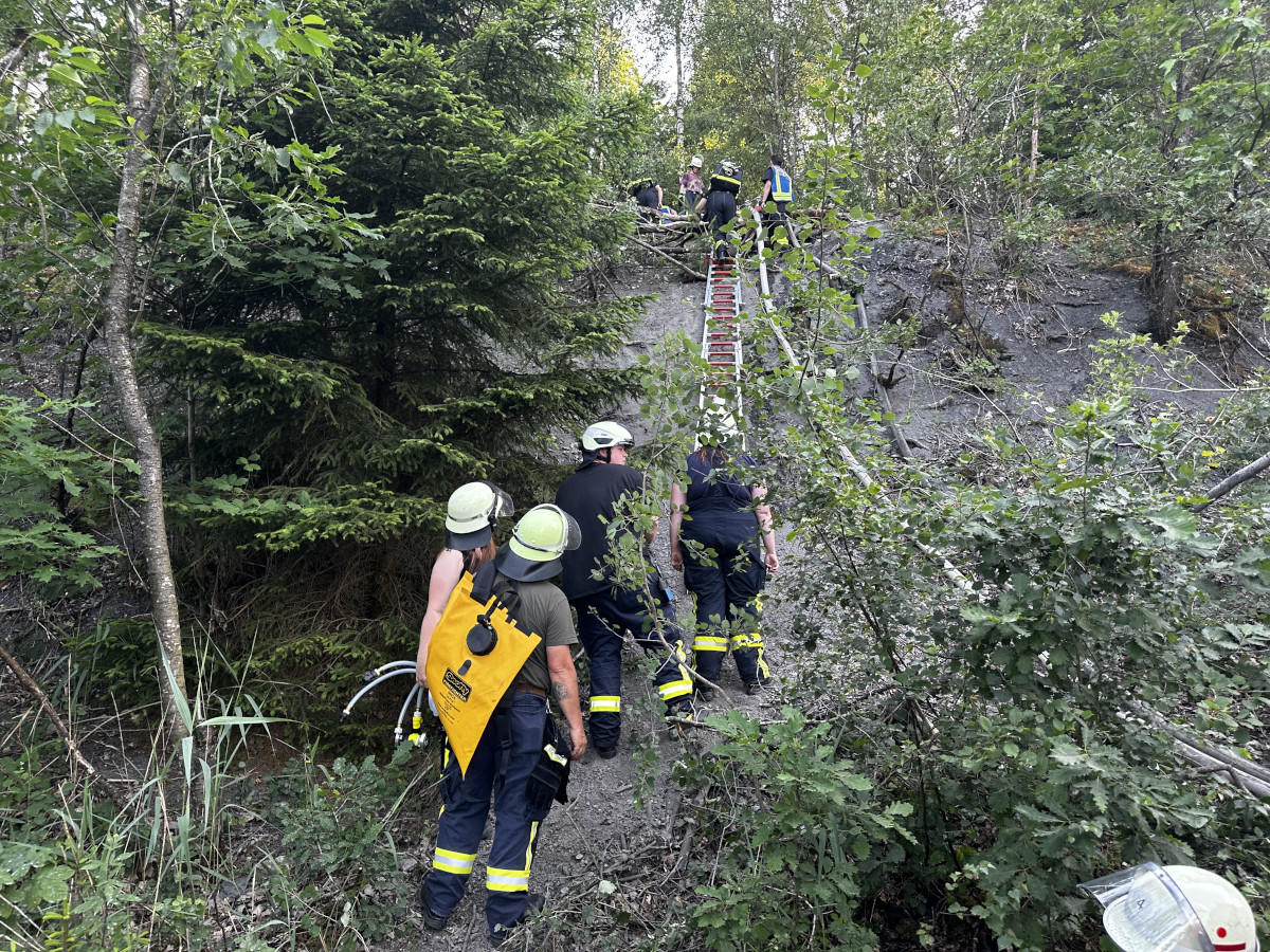 [left][cmsimg]12460[/cmsimg][/left] Gegen 18:30 Uhr hatte sich das Feuer an zwei Brandstellen bereits auf einer Fläche von mehr als 3.000 Quadratmetern ausgebreitet. Die Einsatzkräfte vor Ort kämpften im Wald nicht nur mit den Flammen und der anspruchsvollen Haldentopographie, sondern auch die Sommerhitze setzte ihnen stark zu. Gerade die Hitze forderte von den Einsatzkräften ihren Tribut, mussten doch mehrere Feuerwehrangehörige vorwiegend wegen Kreislaufproblemen, aber auch wegen anderer kleiner Blessuren durch den Rettungsdienst behandelt werden.