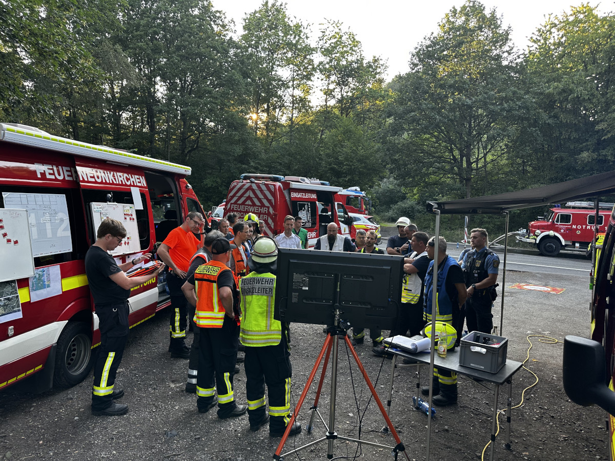 Beim Eintreffen mussten sich die Einsatzkräfte im unwegsamen Gelände der Halde zuerst einen geeigneten Zugang zum Brandherd verschaffen. Mit Motorkettensägen wurden Holzpoller entfernt, um mit den großen Löschfahrzeugen in das Gebiet einfahren zu können. Am Brandherd angekommen, standen die Einsatzkräfte einem Feuer gegenüber, das bereits rund 500 Quadratmeter Vegetation verzehrt hatte und sich weiter ausbreitete. Da sich die Einsatzstelle in einem abgelegenen Bereich befand und eine hohe Ausbreitungsgefahr in Richtung der nahen Bundesstraße B41 bestand, ließ der Einsatzleiter zügig weitere Einsatzkräfte alarmieren. Neben weiteren Löschbezirken der Neunkircher Wehr wurde auch der dezentral aufgestellte Wasserförderzug des Landkreises Neunkirchen hinzugezogen. Dieser spezielle Zug kann mit seiner Ausstattung Schlauchleitungen über lange Strecken verlegen oder Löschwasser im Pendelverkehr mit Tanklöschfahrzeugen an den Einsatzort bringen. Darüber hinaus wurde die Drohneneinheit der Feuerwehr Illingen angefordert, um sich aus der Luft mit Wärme- und Echtzeitaufnahmen einen besseren Überblick verschaffen zu können.