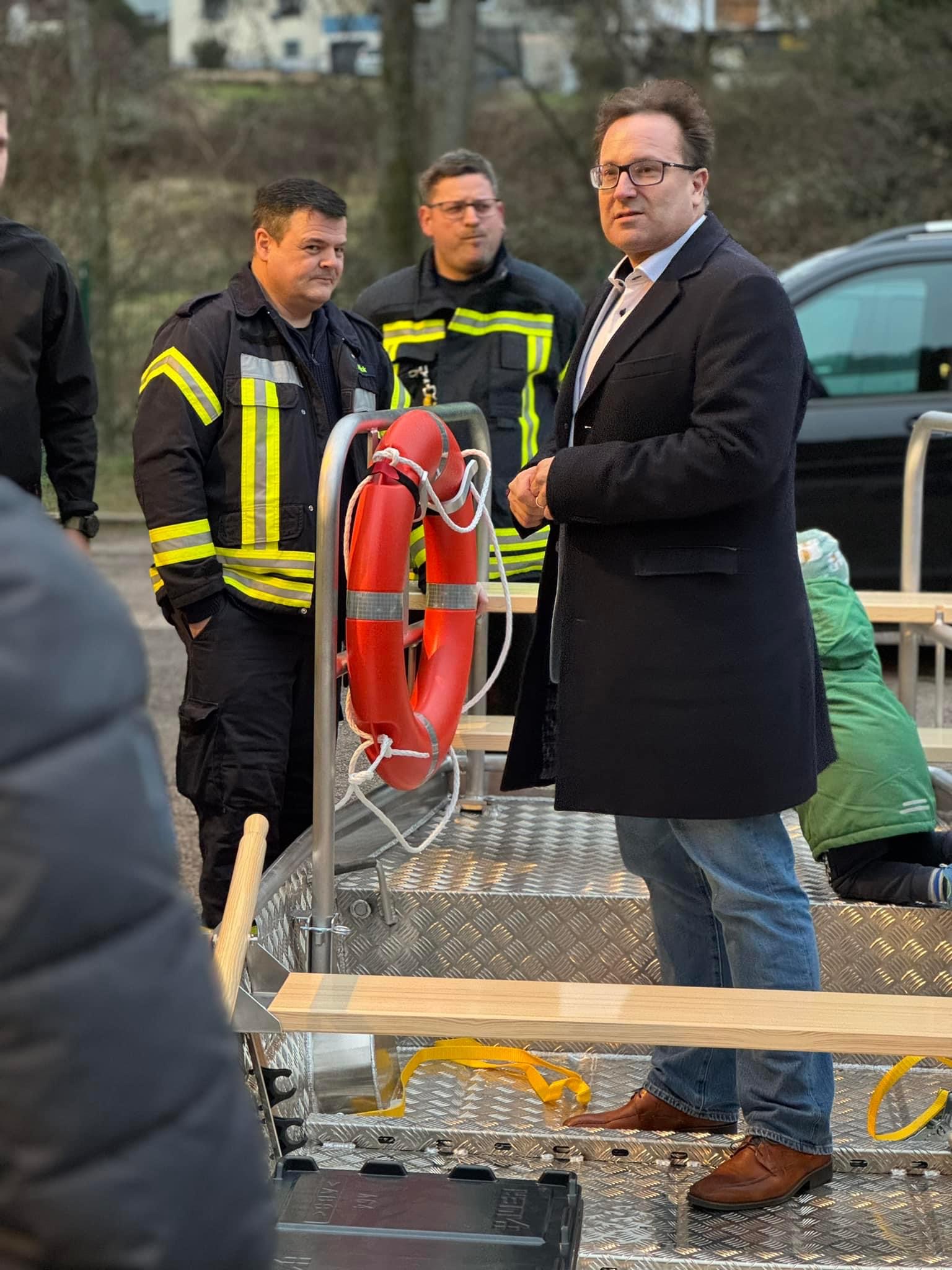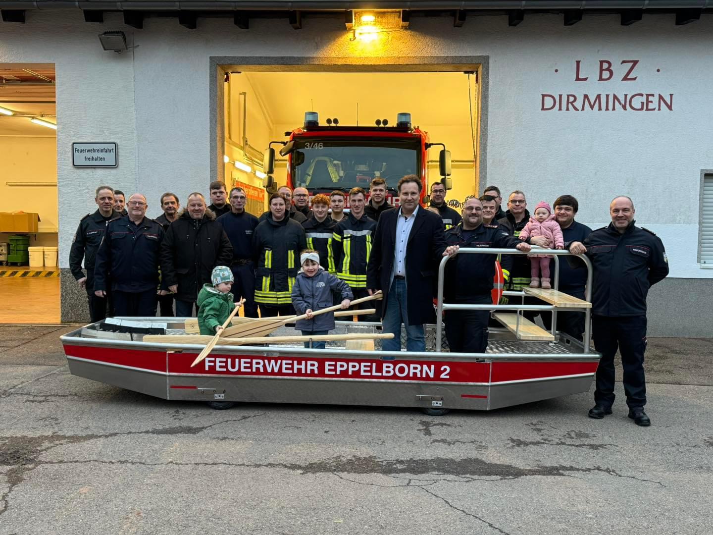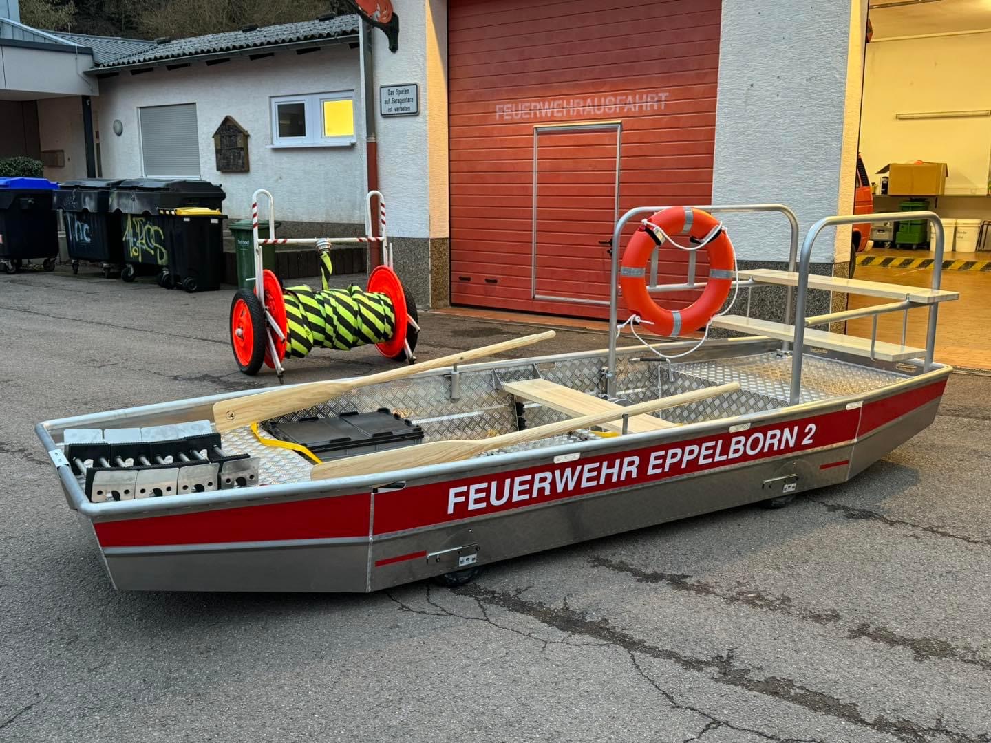 Am 05. Februar ist das neue Flachwasserboot der Feuerwehr Eppelborn im Löschbezirk Dirmingen angekommen. Bürgermeister Dr. Andreas Feld und Ortsvorsteher Frank Klein konnten zusammen mit der Wehrführung das neue Rettungsmittel in Empfang nehmen. Es ist bereits das zweite Flachwasserboot, das innerhalb eines Jahres für die Feuerwehr Eppelborn beschafft werden konnte. Stationiert werden wird das Boot künftig im Löschbezirk Dirmingen. Damit trifft die Gemeinde wichtige Vorsorgemaßnahmen, die dabei helfen werden, künftige Hochwasserlagen besser zu bewältigen. Die Investition von rund 17.000 € gewährleistet die Handlungsfähigkeit in mehreren Einsatzszenarien. So kann das Flachwasserboot nicht nur bei Hochwasser zur Rettung von Menschen, Tieren oder dem Transport von Materialien eingesetzt werden. Durch einen speziellen Rüstsatz mit Schienenbereifung kann das Boot auch im Falle von Bahnunfällen zum Einsatz kommen. Ein weiteres Boot ist zur Stationierung in Eppelborn geplant, womit dann perspektivisch alle Ortsteile, die an das Schienennetz angeschlossen sind, auf ein Flachwasserboot Zugriff haben. Wir alle hoffen natürlich, dass wir von weiteren Hochwassern in unserer Gemeinde verschont bleiben. An zahlreichen Stellen wurde dazu in den letzten Jahren Vorsorge getroffen. Sollte uns dennoch erneut eine Hochwasserlage ereilen, so ist die Feuerwehr Eppelborn mit den beiden Flachwasserbooten nun noch besser vorbereitet und kann entsprechend agieren.
