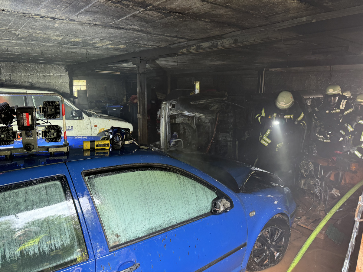 Dichter Rauch am Nachmittag des 25. Mai 2024 in der Ortsmitte von Eppelborn: In einer Werkstatt in der Bahnhofstraße war ein Brand ausgebrochen, Anwohner hatten die Feuerwehr alarmiert. Die Löschbezirke Eppelborn und Bubach-Calmesweiler wurden gegen 15:26 Uhr von der integrierten Leitstelle mit dem Einsatzstichwort "Brand 3" alarmiert. Beim Eintreffen der Einsatzkräfte drang bereits dichter schwarzer Brandrauch aus der rund 100 Quadratmeter großen, eingeschossigen Halle, die als Werkstatt und Lager genutzt wurde. Unter Atemschutz gelange des den beiden Trupps, den eigentlichen Brandherd in der völlig verrauchten Werkstatt zu lokalisieren. Mit 2 Rohren konnte der Brand gelöscht werden. Dazu musste unter anderem die Motorhaube eines in der Halle abgestellten Fahrzeugs mit einem hydraulischen Spreizer geöffnet werden. Mit Überdrucklüftern wurde die Werkstatt dann vom Brandrauch befreit. Damit eventuell versteckte Glutnester nicht zu einem erneuten Aufflammen führen, wurde die gesamte Halle mit Löschschaum geflutet. Am Abend wurde noch einmal eine Nachkontrolle durchgeführt, bei der keine weiteren Feststellungen gemacht werden konnten. Durch den schnellen Einsatz der Feuerwehr konnte ein Übergreifen des Brands auf weitere Gebäudeteile und sich anschließende Wohnhäuser verhindert werden. Es entstand Sachschaden in noch unbekannter Höhe. Die Brandursache ist unklar, verletzt wurde bei dem Einsatz niemand.