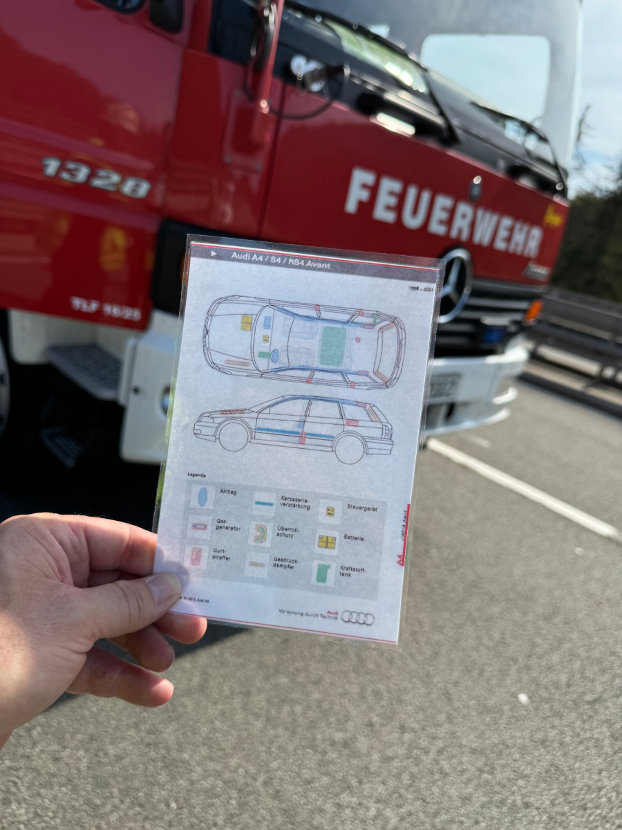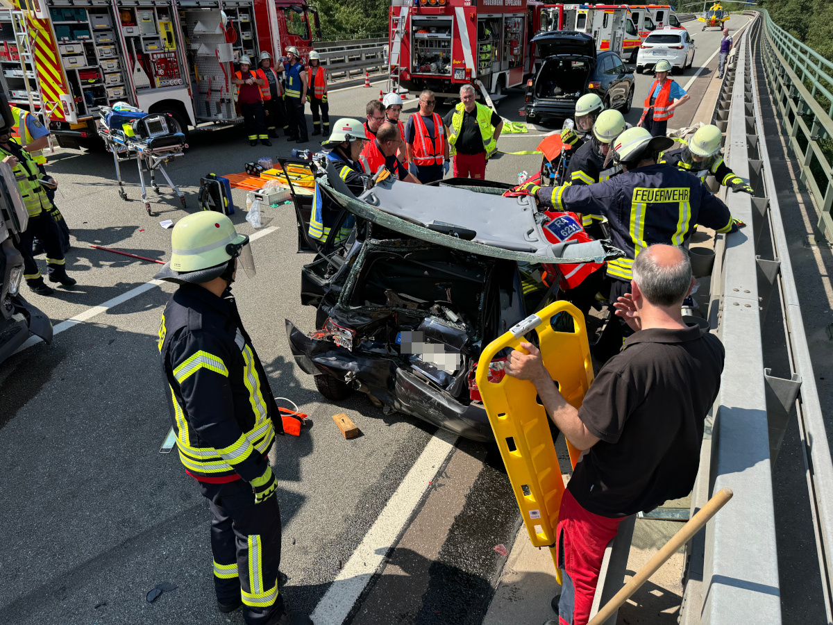 Beim Eintreffen der Feuerwehr waren beide Insassen des Pkw ansprechbar und nicht eingeklemmt. Rettungsdienstlich ausgebildete Einsatzkräfte der Feuerwehr übernahmen die medizinische Erstversorgung bis zum Eintreffen des Rettungsdienstes. Während der Fahrer ohne Hilfsmittel aus dem Fahrzeug befreit werden konnte, musste zur Rettung der Beifahrerin in Absprache mit dem Notarzt das Dach des Fahrzeuges sowie die Seitentüren entfernt werden. Dabei war die im Fahrzeug deponierte Rettungskarte eine große Hilfe.