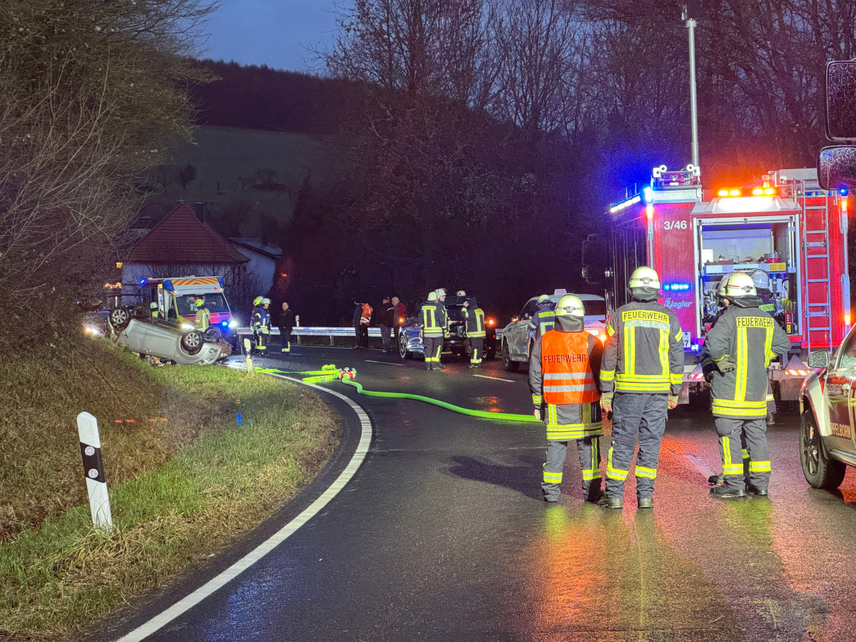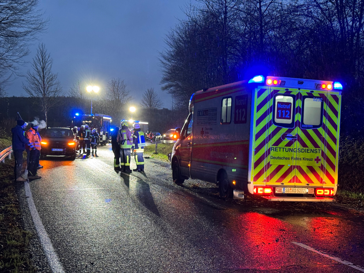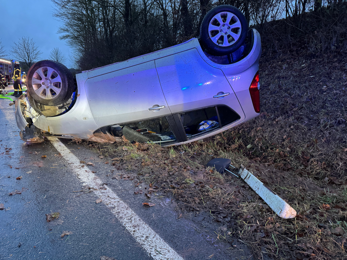 Verkehrsunfall am Abend des 21. Dezember 2024 auf der L112 kurz vor dem Ortseingang von Wustweiler: Der Fahrer eines Pkw war nach rechts von der Fahrbahn abgekommen und hatte sich mit seinem Fahrzeug überschlagen. Das Fahrzeug blieb anschließend auf dem Dach liegen.