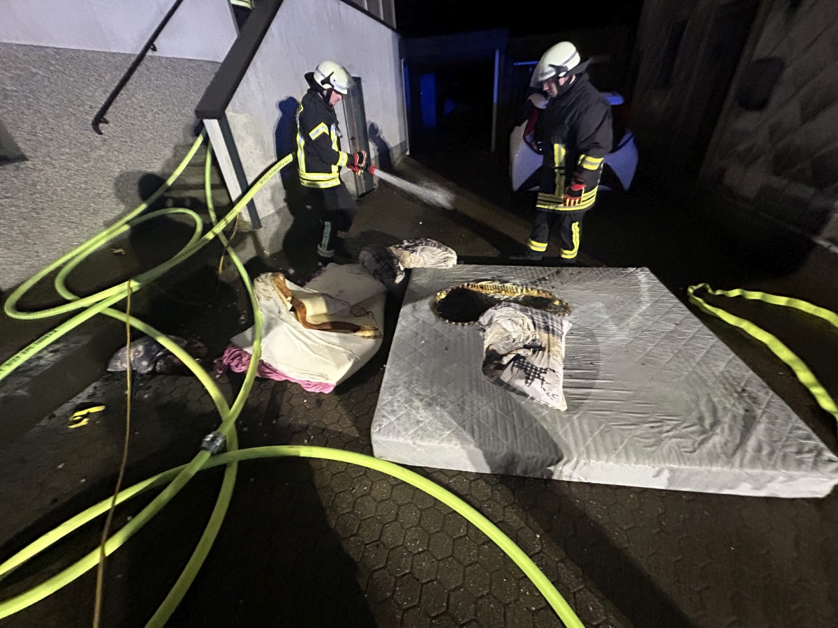 Die Matratze und Bettwäsche wurde von einem Trupp unter Atemschutz aus dem verrauchten Schlafzimmer gebracht und vor dem Gebäude endgültig abgelöscht. Zu größerem Schaden ist es zum Glück aber nicht gekommen: Durch das schnelle Eingreifen der Bewohner und der Feuerwehr konnte ein Ausbreiten des Feuers verhindert werden.