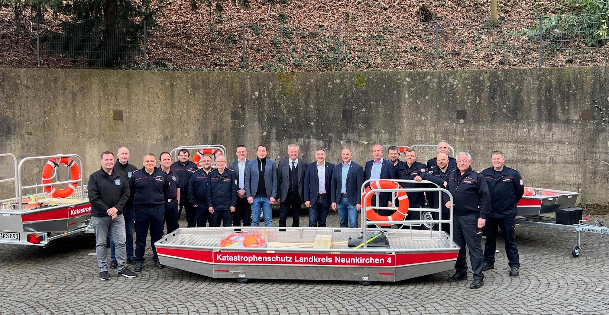 Damit die Feuerwehren des Landkreises Neunkirchen bei Hochwasser und Starkregen noch schneller und effizienter helfen können, wurden nun vier Flachwasserboote offiziell an die Wehren der Kreisstadt Neunkirchen und Stadt Ottweiler sowie der Gemeinde Eppelborn und Merchweiler übergeben.