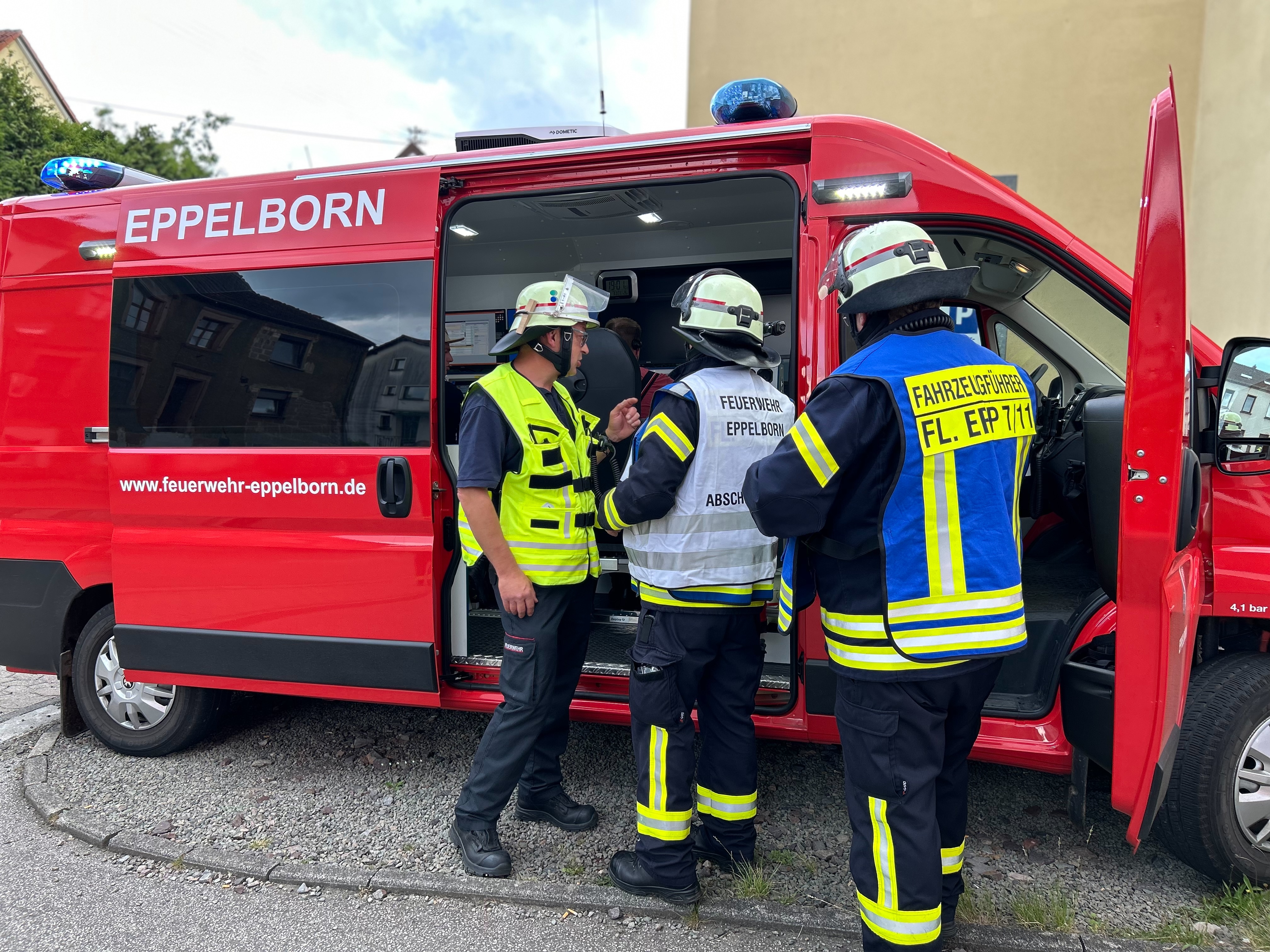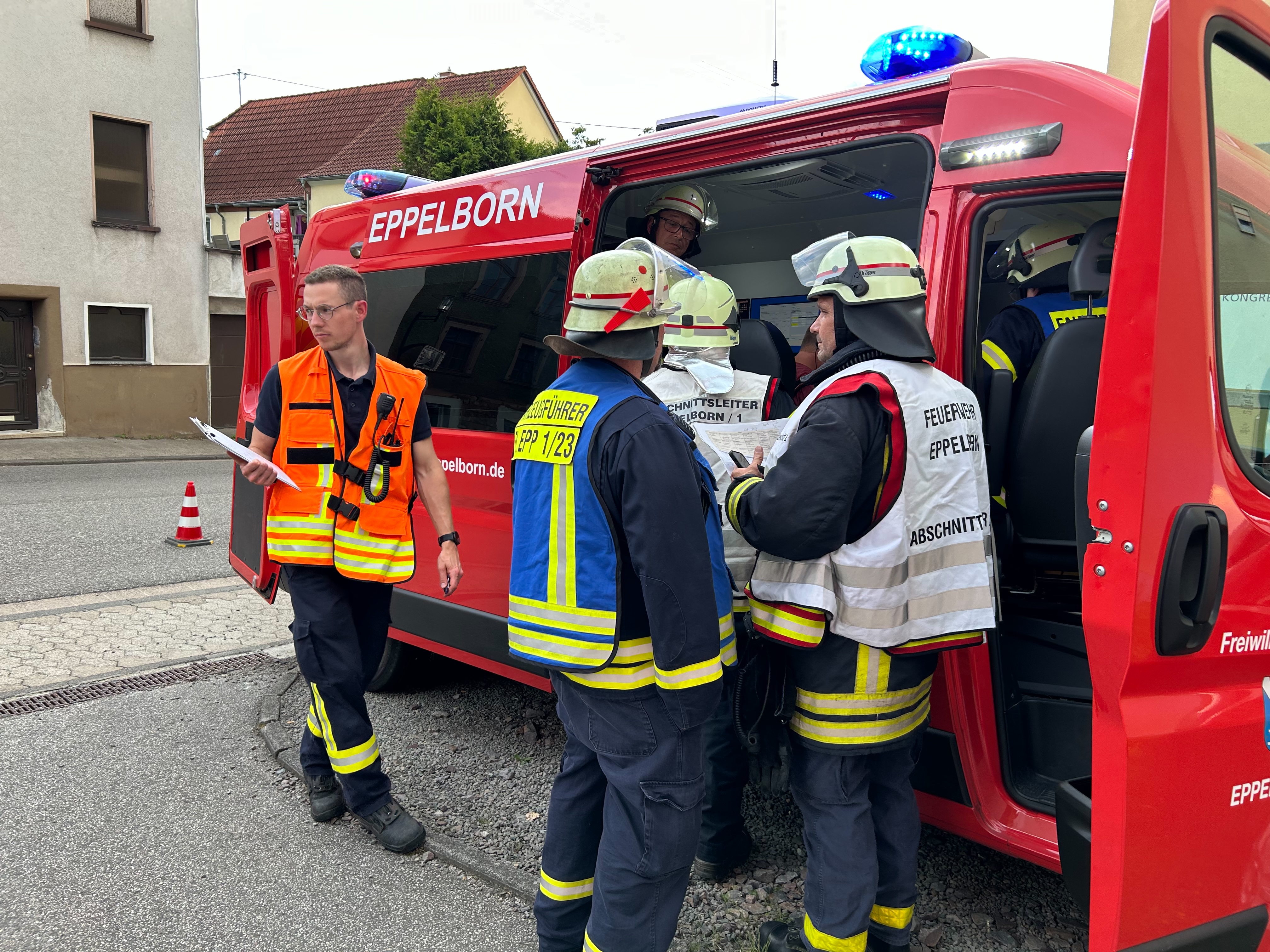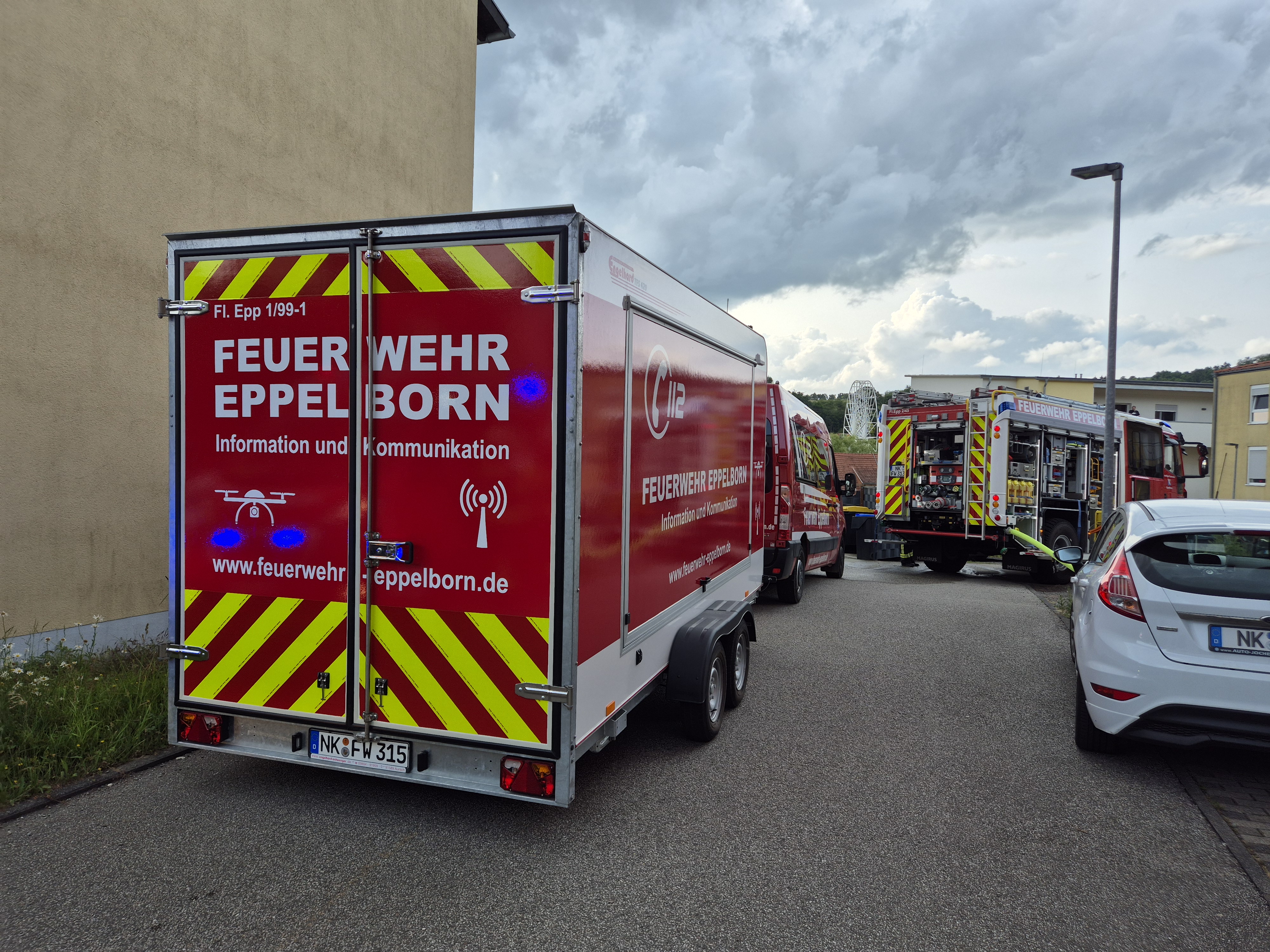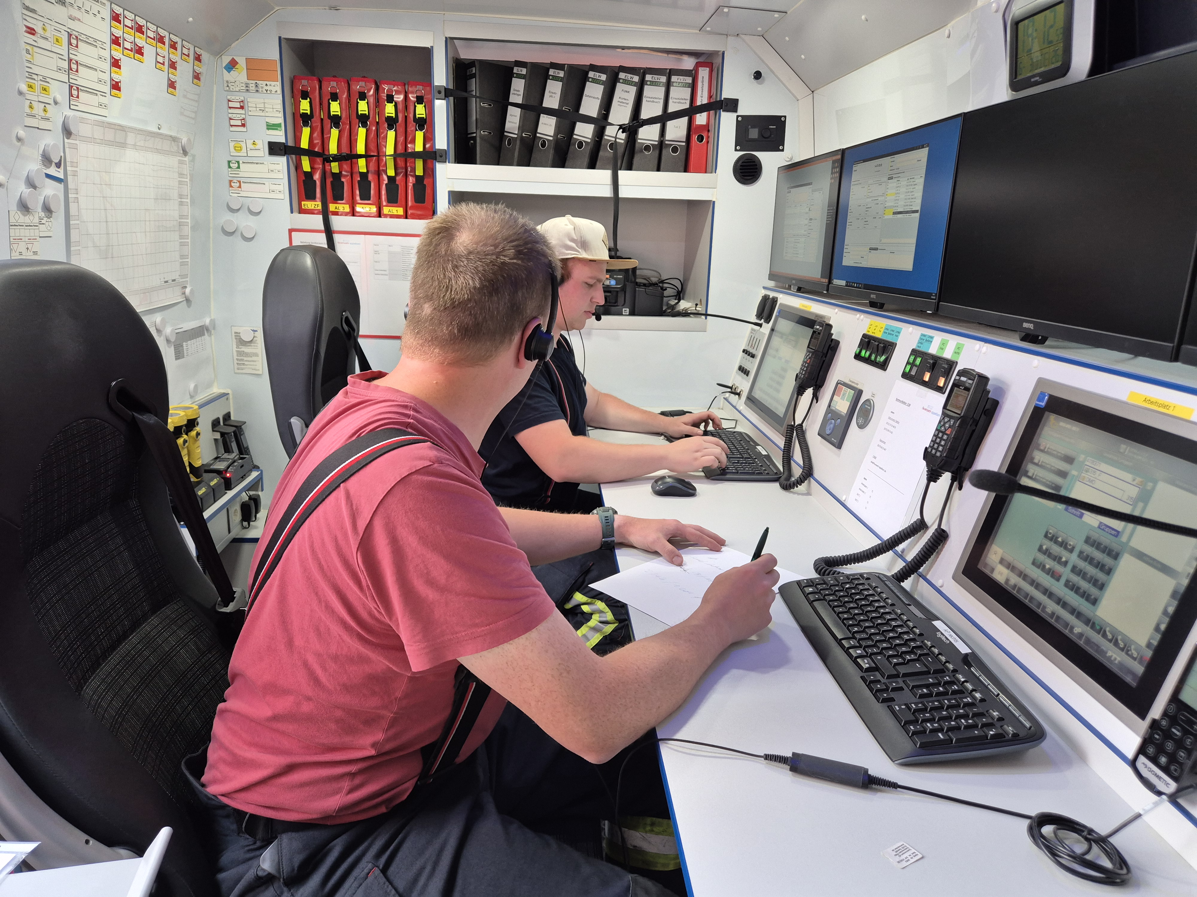 Vom Einsatzleitwagen aus wurde die Übung koordiniert. Der Einsatzleitwagen, der mit der Führungsunterstützungsgruppe der Feuerwehr Eppelborn besetzt wurde, unterstützt den Einsatzleiter bei seiner Aufgabenwahrnehmung, dokumentiert den Einsatz und regelt den Funkverkehr.