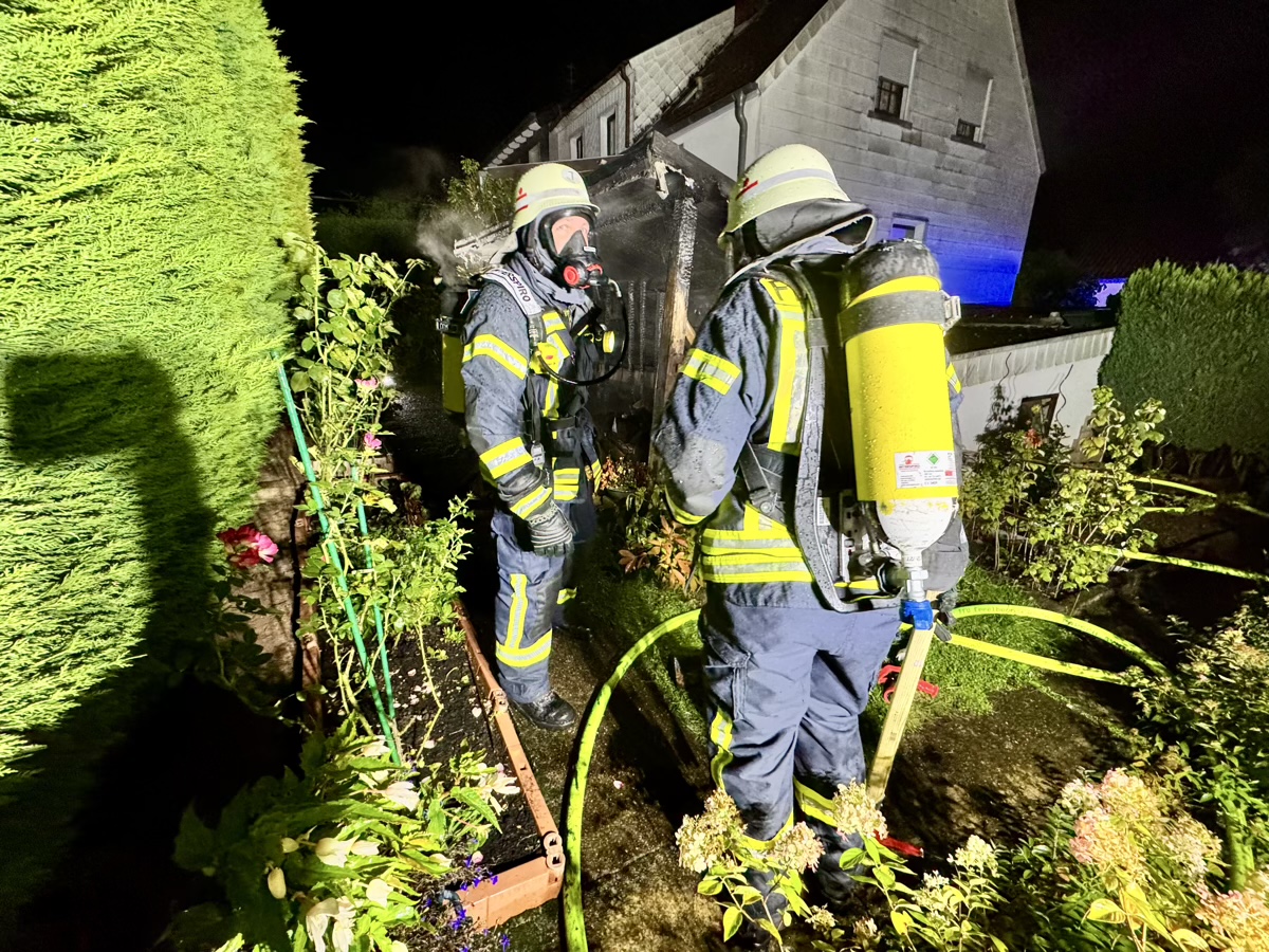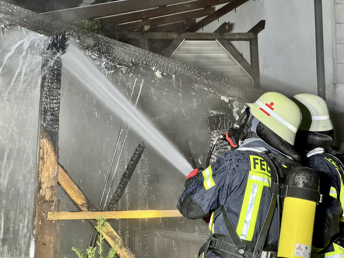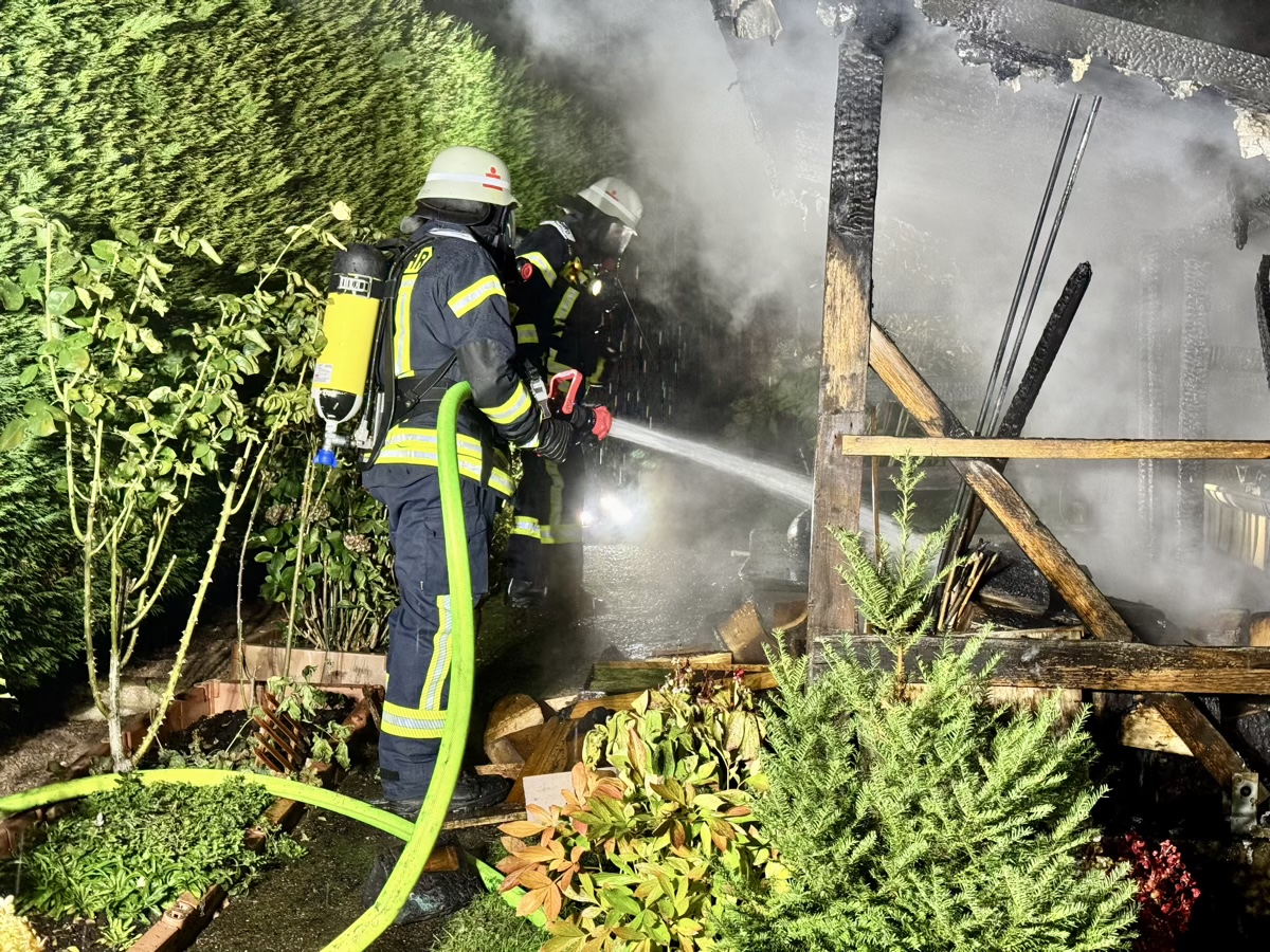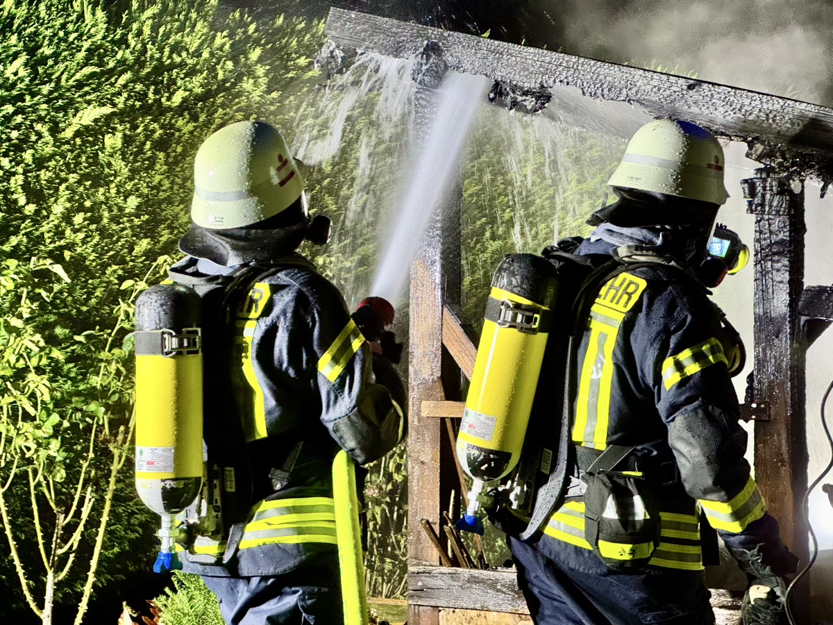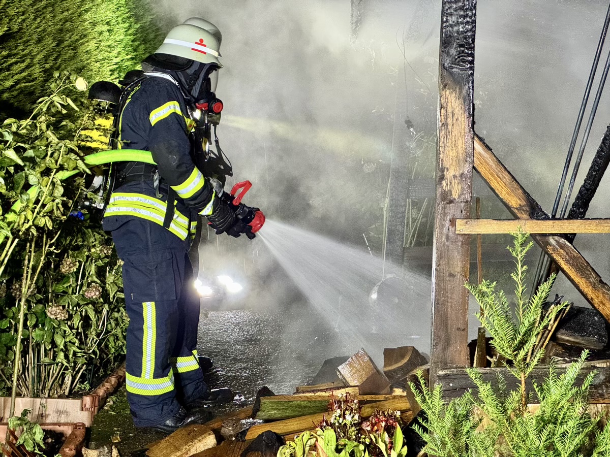 Bei Eintreffen der Einsatzkräfte stand ein Holzunterstand in Flammen. Mit einem C-Rohr konnte der Brand schnell unter Kontrolle gebracht werden. Die Einsatzstelle wurde mehrfach mit einer Wärmebildkamera kontrolliert, um Glutnester zu lokalisieren und gezielt abzulöschen.