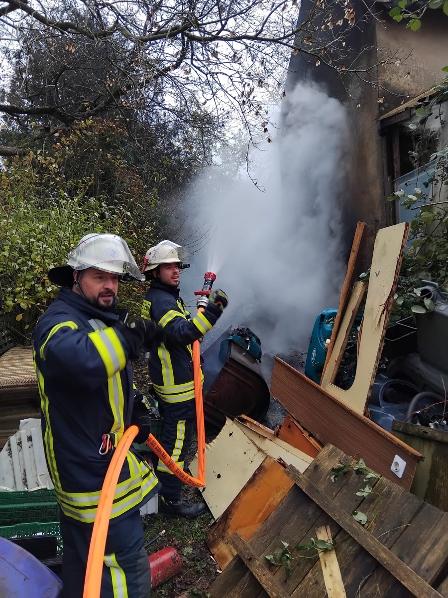 Hinter einem Anwesen brannten Holzabfälle sowie weiterer Unrat. Der Anwohner hatte selbst mit einem Gartenschlauch mit Löscharbeiten begonnen, die Feuerwehr unterstützte ihn mit einem weiteren C-Rohr. Mit der Wärmebildkamera wurde die Einsatzstelle mehrfach kontrolliert, um etwaige versteckte Glutnester aufzufinden.