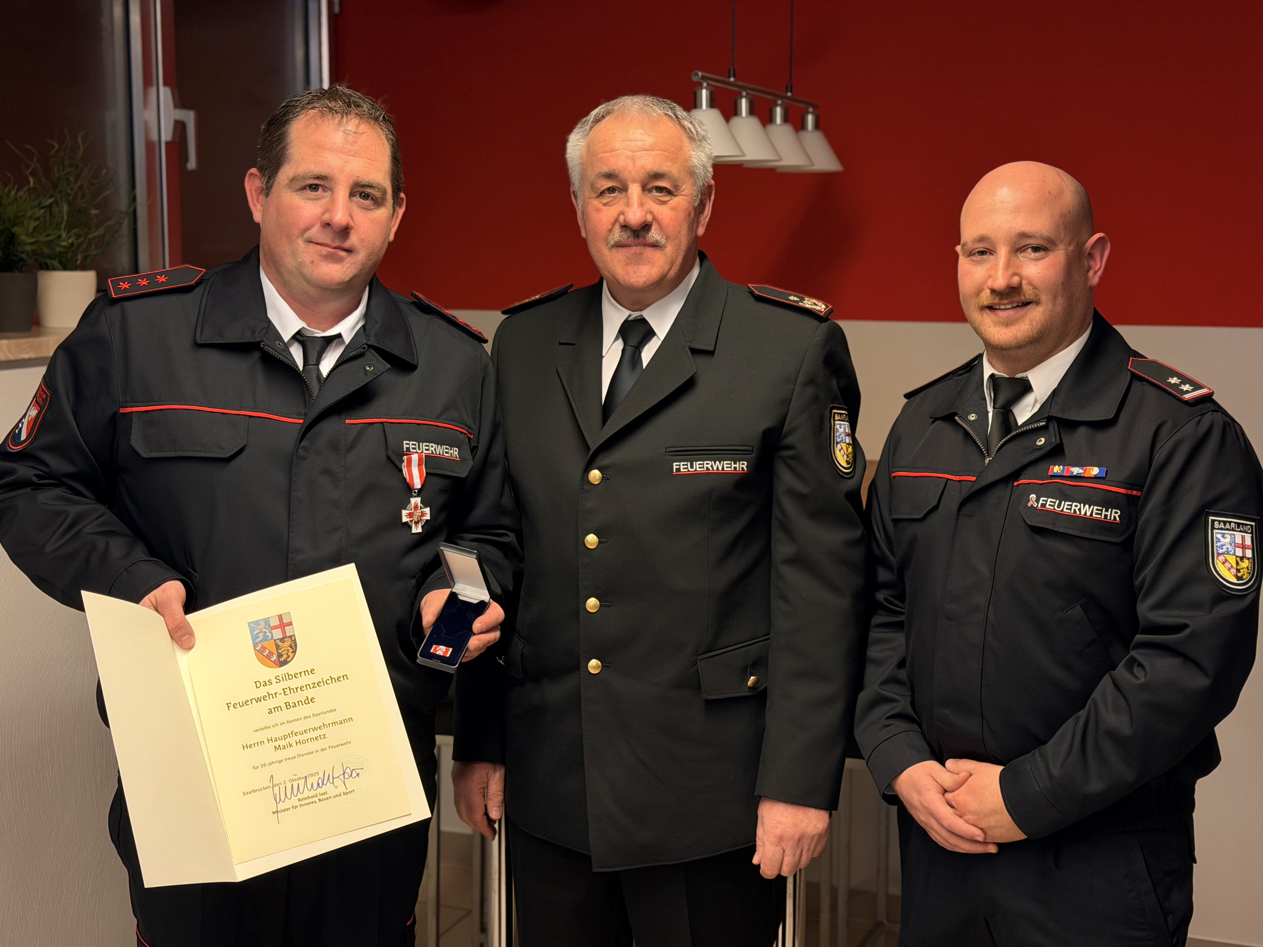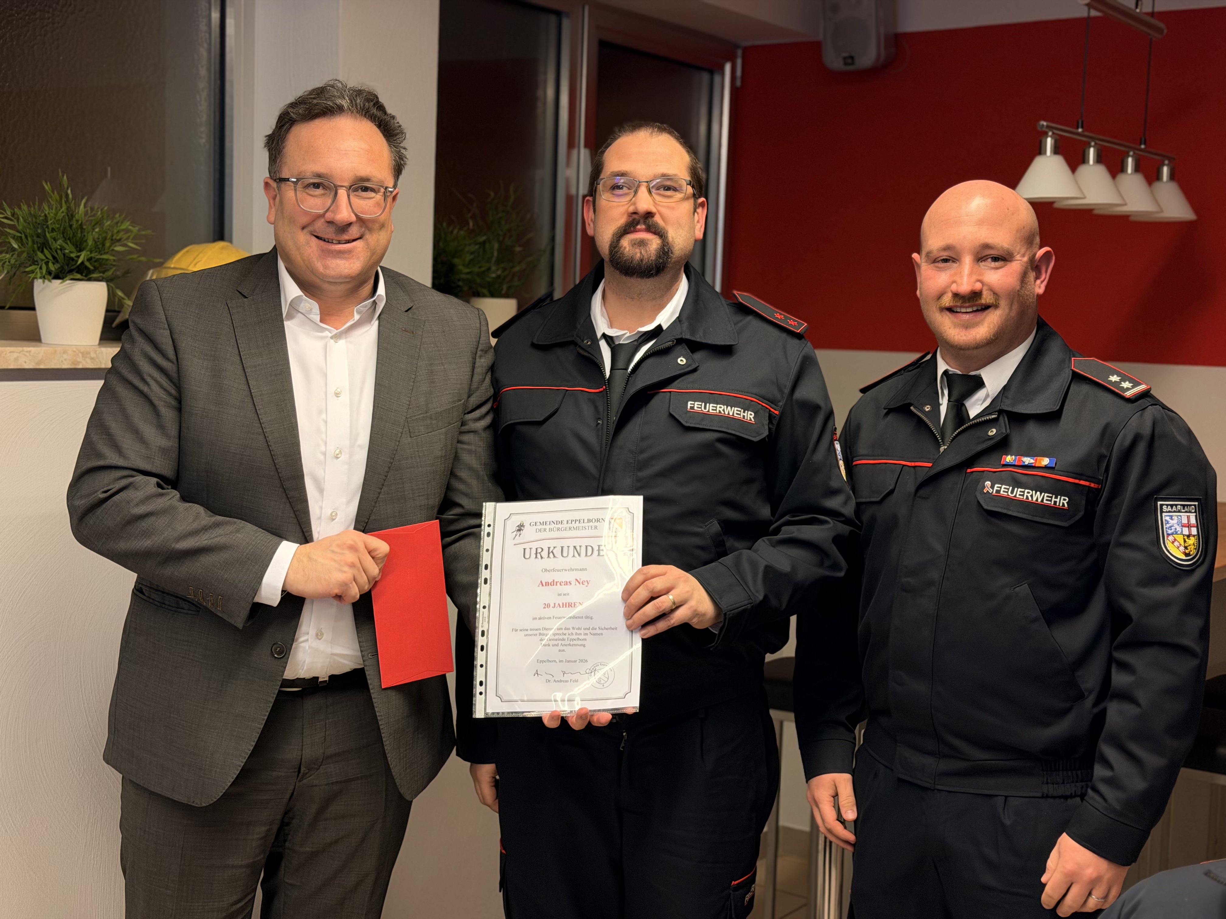 Gleich zu Jahresbeginn, am 03.01.2026 führte der Löschbezirk Habach seine Jahreshauptversammlung durch. Neben den einundzwanzig von aktuell zweiundzwanzig aktiven Mitgliedern konnte Löschbezirksführer auch noch Ehrengäste begrüßen, welche der Einladung folgten. Anwesend waren der Bürgermeister der Gemeinde Eppelborn Dr. Andreas Feld, der stellvertretende Wehrführer Thorsten Fuchs, Kreisbrandinspekteur Michael Sieslack, der Landesjugendbeauftragte Christoph Gillmann sowie Ortsvorsteher Peter Dörr und der Ehrenlöschbezirksführer und Vorsitzende des Fördervereins der Freiw. Feuerwehr Eppelborn – LBZ Habach e.V. Engelbert Ruschel. Im Rahmen der Berichte wurde das Jahr statistisch Revue passieren gelassen. So wurden im Jahr 2025 19 Einsätze abgearbeitet und 22 Übungen durchgeführt. Zudem wurden 25 Brandsicherheitswachen und Ordnungsdienste von den Habacher Wehrleuten geleistet. Im Bereich der Aus- & Fortbildung wurden 19 Lehrgänge auf Gemeinde-, Kreis- und Landesebene besucht. Besonders hervorzuheben war die Durchführung der Jahreshauptübung der Jugendfeuerwehren der Gemeinde Eppelborn sowie eine groß angelegte Einsatzübung am Haus Hubwald. Hier wurden enorm viele Stunden in die Vor- & Nachbereitung investiert. Die Aufarbeitung der Übung am Haus Hubwald mit einhergehender Einsatzplanung wird auch noch intensiv Zeit im Jahr 2026 beanspruchen. Weiterhin wurde im Berichtsjahr 2025 eine Doppelgarage am Feuerwehrgerätehaus Habach durch den Löschbezirk errichtet. Dieses Projekt wurde durch den Förderverein der Freiw. Feuerwehr Eppelborn – LBZ Habach e.V., die Gemeinde Eppelborn, die Vereinsgemeinschaft Habach und durch zahlreiche Einzelspenden unterstützt. Im Rahmen der Grußworte dankte Bürgermeister Dr. Andreas Feld den Einsatzkräften die zahlreiche Stunden für den Feuerwehrdienst leisten. Die Übung am Haus Hubwald habe er selbst vor Ort mitverfolgt und konnte sich vom guten Leistungsstand der Wehr überzeugen. Er hob den besonderen Stellenwert und das Ansehen der Feuerwehr in der Bevölkerung hervor. Zudem teilte der Chef der Wehr mit, dass aktuell die Erstellung eines Brandschutzbedarfsplans durch einen externen Dienstleister in Arbeit ist. Mit dem Brandschutzbedarfsplan ist nach aktuellem Stand im 3. Quartal zu rechnen. Auch die Brandwachengelder für Brandsicherheitswachen wurden zum 01.01.2026 angepasst, sodass diese sich nun nach dem gesetzlichen Mindestlohn richten. Auch der stellvertretende Wehrführer Thorsten Fuchs dankte den Einsatzkräften für ihr Engagement, das auch im Löschbezirk Habach über die Grenzen des Löschbezirkes hinaus geht. Der Kreisbrandinspekteur Michael Sieslack schloss sich den dankenden Worten an und informierte noch über die bereits getätigten und noch bevorstehenden Anschaffungen im Material über den Landkreis Neunkirchen. Zuletzt ergriff Ortsvorsteher Peter Dörr das Wort und sprach den Dank im Namen des Ortsrates und der Habacher Bevölkerung aus. Der Löschbezirk Habach ist mehr wie nur eine Institution zur Gefahrenabwehr. Er ist auch ein fester Bestandteil im Habacher Vereinsleben. Unter dem letzten Tagesordnungspunkt wurden noch Anfragen und Informationen abgearbeitet. Unter anderem wurde das Thema des Räumens von Schnee sowie das Entfernen von Laub an und um die Feuerwehrgerätehäuser angesprochen. Hier teilte Dr. Feld mit, dass aktuell an einer Lösung für einen sicheren Zu- und Abgang an den Feuerwehrgerätehäusern gearbeitet wird. Bevor die Sitzung geschlossen wurde, standen noch Ehrungen für langjährige Mitglieder aus. So wurde der Oberfeuerwehrmann Andreas Ney durch den Bürgermeister für 20 Jahre Mitgliedschaft geehrt. Hauptfeuerwehrmann Maik Hornetz wurde durch das Land, vertreten durch den Kreisbrandinspekteur, mit dem silbernen Ehrenzeichen am Bande für 35 jährige Mitgliedschaft geehrt. Zu guter Letzt stand noch eine ganz besondere Ehrung auf dem Plan. Dem Brandmeister Helmut Ruschel wurde durch die saarländische Jugendfeuerwehr die Ehrennadel in Silber für besondere Verdienste im Bereich der Jugendfeuerwehr verliehen. In einer Laudatio an den zu Ehrenden Ruschel gab Löschbezirksführer René Finkler einen Rückblick über den Werdegang von Helmut Ruschel, welcher zum Jahreswechsel in die Alterswehr wechselte. Helmut Ruschel trat 1972 als Gründungsmitglied im Alter von 12 Jahren in die Jugendfeuerwehr Habach ein. Im Jahr 1978 wechselte er in den aktiven Feuerwehrdienst und übernahm sofort die Position des stellvertretenden Jugendbeauftragten im Löschbezirk. Bereits sechs Jahre später im Jahr 1984 übernahm er das Amt des Jugendbeauftragten und führte dies durchgehend bis zum Jahr 2009 aus. Während dieser Zeit nahm Helmut Ruschel unter anderem zeitweise die Aufgabe des Funkwartes wahr und von 1995 bis 2006 das Amt des stellvertretenden Löschbezirksführers unter seinem Bruder Engelbert Ruschel, welcher das Amt des Löschbezirksführers Inne hatte. Nach nun 53 Jahren Mitgliedschaft, davon 47 Jahren aktivem Einsatzdienst, wechselt Helmut Ruschel in die Alterswehr und tritt somit in den Feuerwehrruhestand ein. Unter tosendem Applaus der Versammlung wurde Helmut Ruschel durch den Landesjugendbeauftragten Christoph Gillmann die Ehrennadel und durch René Finkler eine Dankesurkunde des Löschbezirkes sowie ein Geschenk überreicht.